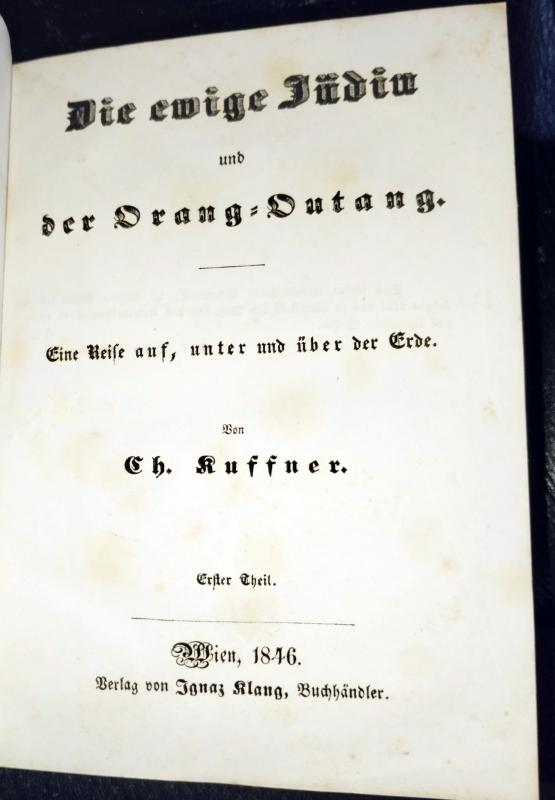 Die ewige Jüdin und der Orang-Outang. Eine Reise auf, unter und über der Erde. 2 Bde. Wien, Klang 1846 - 1847. 3 Bll., 285 S., 1 Bl.; 376 S. Pappbde. (Verlagseinbände) d. Zt.