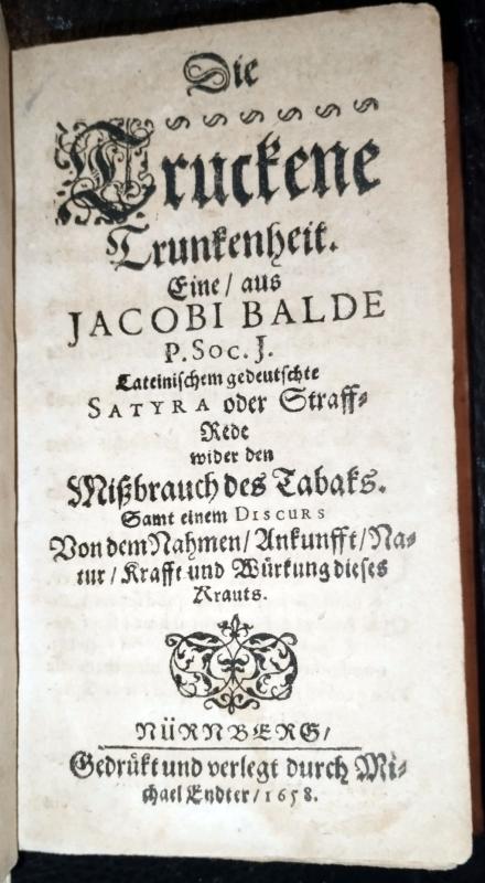 Die Truckene Trunkenheit / Eine/ aus Jacobi Balde P. Soc. J. Lateinischem gedeutschte Satyra oder Straff-Rede wider den Mißbrauch des Tabaks. Samt einem Discurs Von dem Nahmen/ Ankunfft/ Natur/ Krafft und Würkung dieses Krauts. (Nachdichtung durch Sigmund von Birken). Nürnberg, Endter 1658. Mit Kupfertitel. 3 Bll., 256 S. Prgt. um 1900, mit kalligraphischem Rückentitel. 13 x 8 cm.