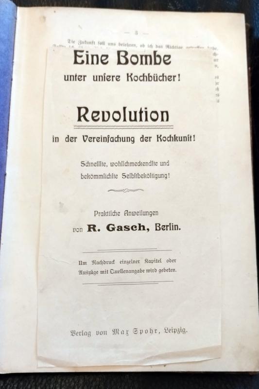 Weiss 3416. - Erste Ausgabe. - Die letzten Bll. an der unteren Ecke fingerfleckig. Vorgebunden: Gasch, R.: Eine Bombe unter unsere Kochbücher! : Revolution in der Vereinfachung der Koch-Kunst! Schnellste, wohlschmeckendste und bekömmlichste Selbstbeköstigung. Praktische Anweisungen. Leipzig, Max Spohr (1905). Tit., 80 S. - Weiss 1181. - Der Verlag ist bekannt für Schriften zur Homosexualität und Esoterik. - Titelblatt lose und allen Seiten stark beschnitten. Es fehlt das erste Blatt des Vorworts. - Zwei recht kuriose Kochbücher mit marktschreierischen Titeln, die aber wohl das Kochen nicht revolutioniert haben. - Berieben.