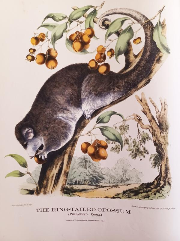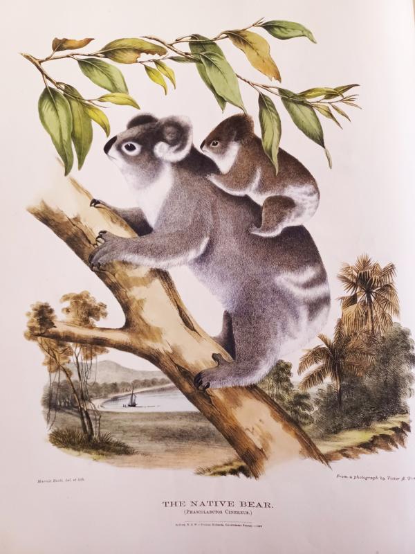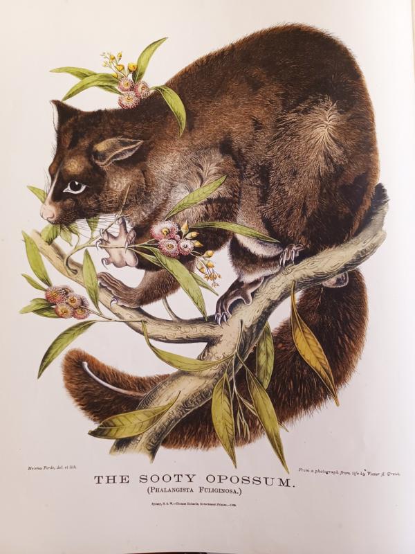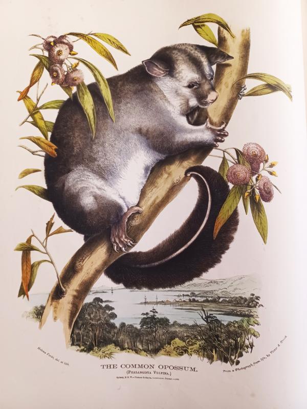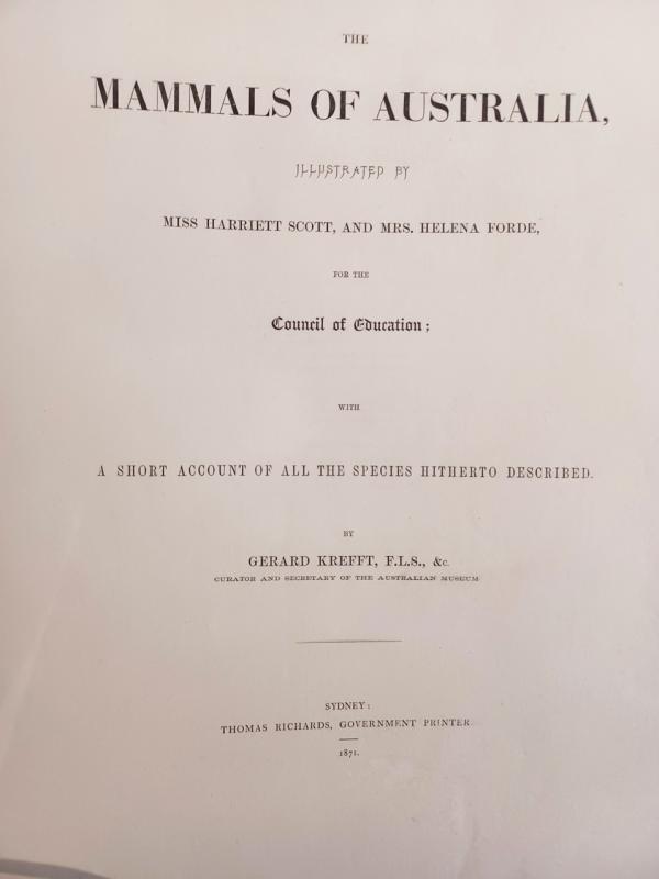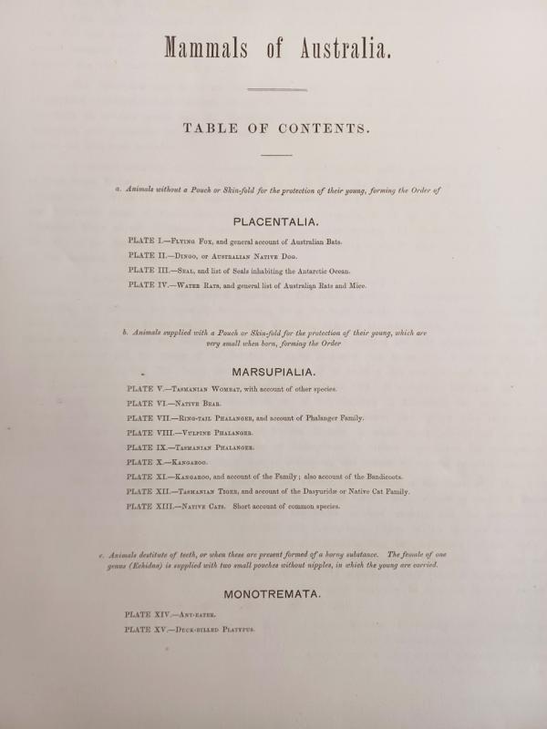 Large Folio. 473 mm x 400 mm. 3 unnum. pp., 7 pp. Illustrated with 16 fine hand colored lithographs and descriptive text. A beautiful hand colored example of this rare illustrated monograph about the mammals of Australia. Drawn by A.W. Scott, the lithographs were done by his daughters Harriett and Helena. The text was compiled by Gerard Krefft. Krefft (1830-1881) was curator of the Australian Museum and built up the museum's collections and won international repute as a scientist. He corresponded with Charles Darwin, Richard Owen and many others and was one of the few Australian scientists to accept Darwin's theory on evolution. 'Some of his observations on animals have not been surpassed and can no longer be equalled because of the spread of settlement'.