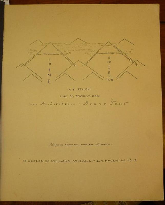 Bruno Tauts phantastisches Hauptwerk, nach den utopischen Ideen von Paul Scheerbart, die Alpen kristallgläsern zu überbauen. Die fünf Teile (Nr. 3 ohne Zwischentitel) heißen: Kristallhaus, Architektur der Berge, Der Alpenbau, Erdrindenbau und Sternenbau. - Einband gering angeknickt, Wenige Bl. m. leichten Knicken, sonst und insgesamt ein außergewöhnlich schönes und wohlerhaltenes Ex.
