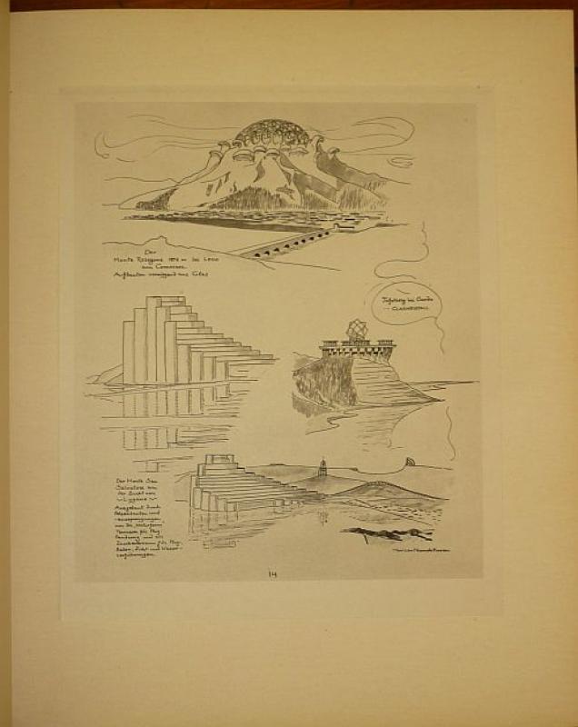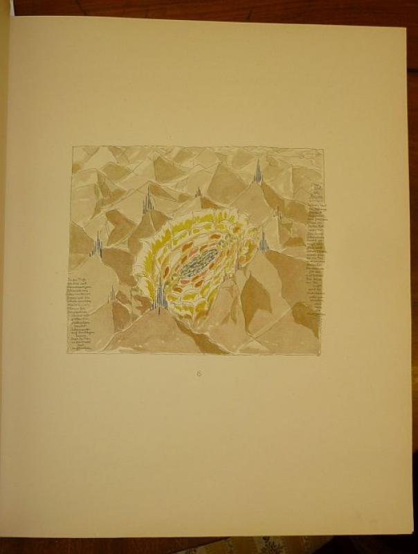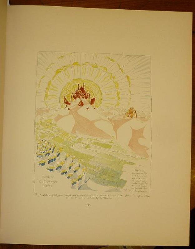 Alpine Architektur. In 5 Teilen und 30 Zeichnungen. Hagen i.W., Folkwang-Verlag, 1919. Folio (40 x 34 cm). Mit gez. Titel u. mont. Inhaltsvzer. u. Zwischentiteln sowie 30 meist mont. Taf., davon 8 farbig und einige gold- bzw. silbergehöhte Zeichnungen.