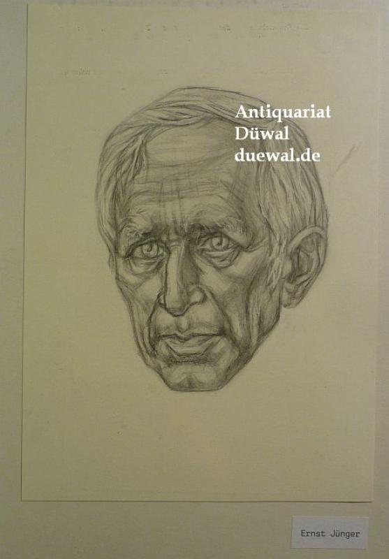 Eigenhändige Karte m. Unterschrift; Brief m.U. - Dazu Original-Bleistiftzeichnung mit Jünger-Portrait und ein Konvolut mit Korrespondenz u. Dokumenten zu einer Ernst-Jünger-Medaille von 1992 des Medailleurs Harry Maximilian Buchberger (1923-2013).