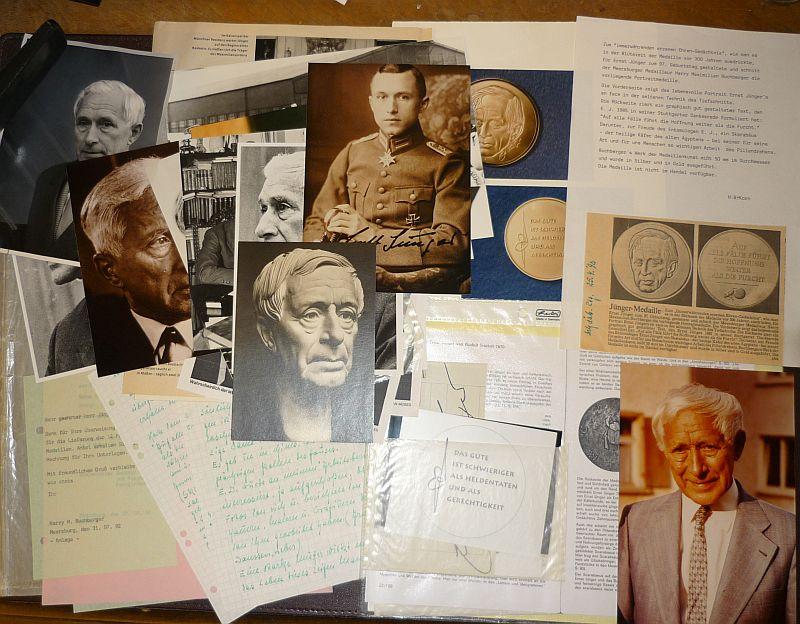 Eigenh. Ansichtskarte m. U., 22.XII.1991. 8vo. Karte zeigt einen Nachtfalter, der Jünger gewidmet ist. "Sie suchten ein Motto Wie wärs mit 'Auf alle Fälle führt die Hoffnung weiter als die Furcht!' Oder einen Scarabaeus oder diesem Schmetterling?" Die Medaille, welche in einer kleinen Auflage von ca. 35 Stück hergestellt wurde und nicht in den Handel kam, trägt tatsächlich das Motto und zeigt einen pillendrehenden Scarabaeus Ein Exemplar, von dem ein Bild beiliegt, zeigt aber einen Vorentwurf bzw. eine Sonderprägung mit einer anderen Revers-Seite mit einem anderen Zitat, ohne den Käfer. - Brief mit eigenhändiger Unterschrift, 12.6.1992. 1/2 S. 4to. Mit gedrucktem Briefkopf. Bestellung von 12 Medaillen. - Dazu: Eigenhändige Bleistiftzeichnung Buchbergers von Jünger als Vorzeichung für den Metallschnitt; kleinere Abb. u. Vorarbeiten, Diapositive usw., 3 S. hs. Notizen Buchbergers über einen Besuch bei Ernst Jünger. Durchschläge von Briefen u. Rechnungen an Jünger alle mit Bezug auf die Medaille. Farbfotos der vergoldeten Medaille im ersten Entwurf, Zeitungsausschnitt mit Abb. der Medaille sowie andere Presseartikel zu Jünger u. 1 Verlagsprospekt, zahlr. Photographien Jüngers sowie 1 Text zu einer früheren Jünger-Medaille (1970) von Rudolf Triebel.