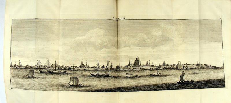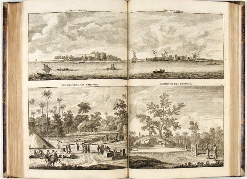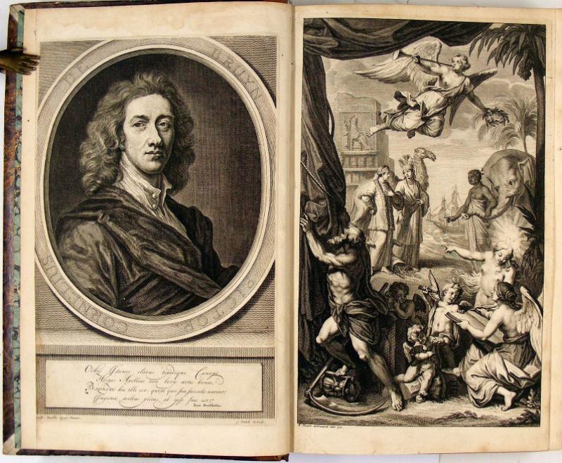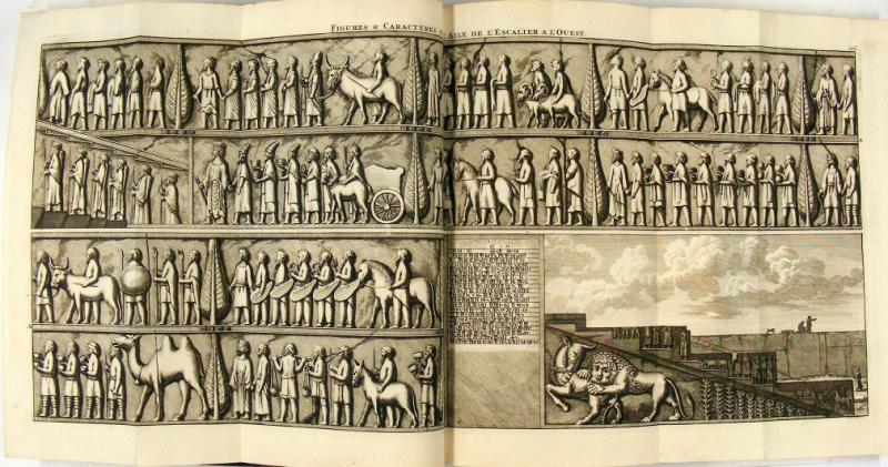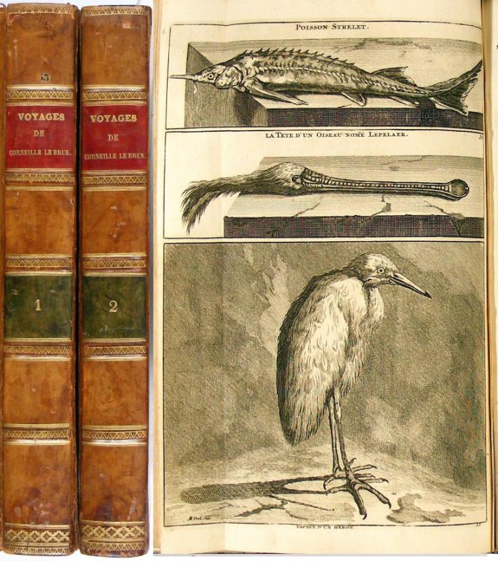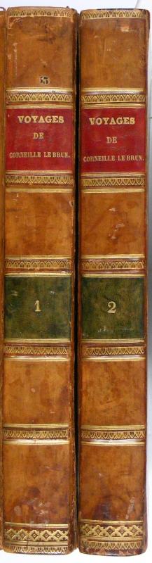 Voyages De Corneille Le Brun Par La Moscovie, En Perse, Et Aux Indes Orientales. Ouvrage enrichi De plus de 320. Tailles douces, des plus curieuses, Representant Les plus belles vuës de ces Païs ... Avec les Antiquitez de ces Païs, & particulierement celles du Fameux Palais De Persepolis. Que les Perses appellent Chelminar ... On y a ajoûté la route qu'a suivie Mr. Isbrants, Ambassadeur de Moscovie, En traversant la Russie & la Tartarie, pour se rendre à la Chine. Et quelques Remarques contre Mrs. Chardin & Kempfer. Avec une Lettre écrite à l'Auteur, sur ce sujet. 2 Bände (2 volumes). Amsterdam, Wetstein 1718. 33 x 21 cm. [6] Bl., [3] gef. Blatt (Karten), 252 S., [54] Bl. Illustrationen; [1] Bl., S. 253 - 468, [60] Bl. Illustrationen. Titelblätter jeweils in Rot und Schwarz gedruckt. Mit Kupferstich-Porträt, Kupferstich-Frontispiz, 3 gefalteten Kupferstich-Landkarten, 271 (von 273) meist num. Kupferstichen auf 113 (von 114) meist gefalteten Kupferstich-Tafeln und 44 Textkupfern. Das häufig fehlende Blatt 469 mit der Anweisung an den Buchbinder faksimiliert eingebunden. Halbleder wohl des 19. Jhs mit Rückenvergoldung und je einem roten und grünen, goldgeprägten Titelschild.