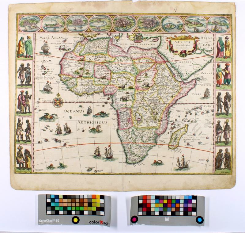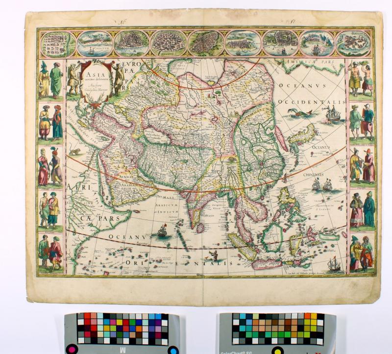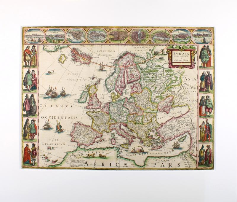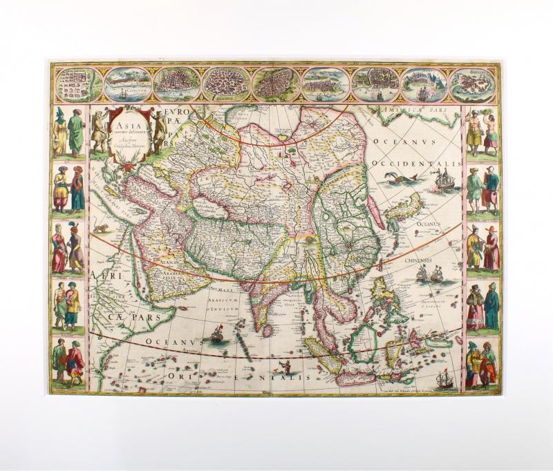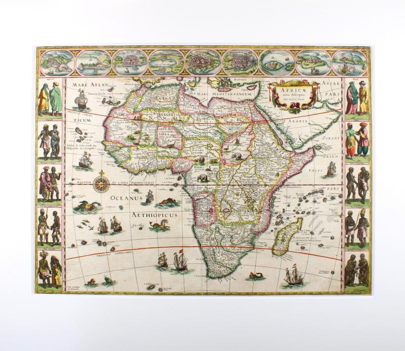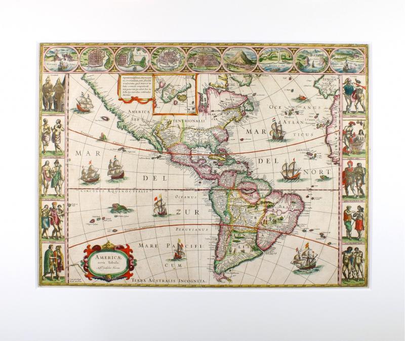 World 'Nova Totius Terrarum Orbis Geographica ac Hydrographica Tabula ': Shirley describes this world map as a 'classic single-sheet world map on Mercator's projection... celebrated as one of the supreme examples of the map maker's art'. 'The map has been expertly reduced from the Blaeu's large world map of 1605. The engraver Josua van den Ende signed in the lower right corner. The most striking characteristic are the superb border decorations. Along the top are allegorical of the sun and the moon and the known five planets - Mercury, Venus, Mars, Jupiter and Saturn. Down the sides are, on the left, four panels illustrating the elements (Fire, Water, Air and Earth), and on the right, the four seasons. Along the bottom are seven vignettes showing the seven ancient wonders of the world: the Hanging Gardens of Babylon, the Colossus over the harbour at Rhodos, the Pyramids, the Mausoleum of Halicarnassus at Caria, the Temple of Diane, the Statue of Jupiter, and the conical lighthouse of Alexandria.' (R. Shirley, The Mapping of the World, Entry 255). The map appeared in the Blaeu Atlas from 1630 until 1658. Africa 'Africae nova descriptio': Much of the geographical information of this carte-à-figures map is still based on the Ptolemaic maps, with the Nile shown with its source in the Lakes Zaire and Zaflan. Also included are various other mythical lakes and rivers including the famous Lake Sachaf of Laurent Fries. Only coastal towns are named on the Cape, with the printing covering much of the unknown territory. Decorated with a title cartouche, elephants, lions, ostriches on the land areas, and galleons and sea monsters on the sea. With vignette scenes of regional types to the left and right and cities along the top border. America 'Americae nova Tabula': The delineation of the coast are basically Spanish in origin and follow the maps of Ortelius and Wytfliet. Willem Blaeu has added the English names on the East Coast given by the Roanoke colonists in Virginia and by Frobisher, Davis and Hudson to the far north. He has added French names in Florida and along the St Lawrence. European geographers still had no knowledge of the extent of the Mississippi. From the expedition journals of De Soto (1539-43) they had inferred an extensive range of east west trending mountains north of the Gulf of Mexico, precluding any great river system. The Great Lakes were unknown. With an inlay map of Greenland. Decorated with a title cartouche, natives on the South America land area, and galleons and sea monsters on the sea. With vignette scenes of regional types to the left and right and nine city views along the top border. Asia 'Asia noviter delineata': This map is a reduced version of Blaeu's 1608 Asia wall map and first published separately in 1617. The map contains extensive details showing what was known of Asia in the early 17th century. Since the Blaeu family were official cartographers to the United East India Company from 1633, their Asia maps have been continuously improved. But the map still has errors, e.g. Korea is still an island. Japan has a predominantly east to west direction and Australia has yet to appear. In China, the Great Wall is shown. Decorated with a figural title cartouche, elephants, lions, camels on the land areas, and galleons and sea monsters on the sea. With vignette scenes of regional types to the left and right and nine city views along the top border. Europe 'Europa recens descripta': This single-sheet versions of Blaeu's 1608 Europe wall map were first published separately in 1617.. The mythical island of Frisland still appears between Iceland and Greenland. Decorated with a figural title cartouche, bears and lions on the land areas, and galleons and sea monsters on the sea. With vignette scenes of regional types to the left and right and nine city views along the top border showing Amsterdam, Prague, Constantinople, Venice, Rome, Paris, London, Toledo and Lisbon. Shirley, World 255. Burden 189. Goss, Mapping of North America 26. Norwich, Map 32. Betz, 57.2. Yeo, Mapping of the Continent of Asia, no. 24. Schilder MCN VI, 1.4, 11.2, 16.4, 21.2 and 26.3