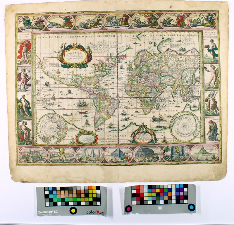 Complete matching set of the World and the Continents with borders by Willem J. Blaeu. Published 1635 in Amsterdam, originally coloured, german text verso. These five maps represent the apogee of seventeenth century Dutch cartography. With their decorative panels of costumed figures, city views and mythological personifications, they helped establish an iconography in the popular imagination which endures to this day. Original old hand colouring and original wide margins, never framed before, centrefoldes sometimes backed in lower and upper margin, soiling in the margins, some tears, colour only in small parts refreshed.