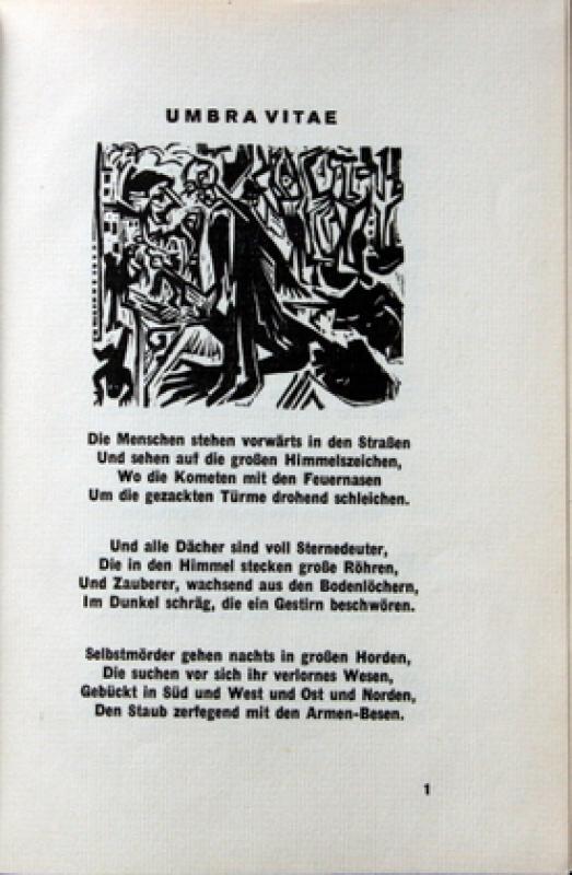 Umbra vitae. Nachgelassene Gedichte. München, Kurt Wolff, 1924. 1 w. Bl., 3 Bll., 62 S., 2 Bll. Mit Holzschnitt-Titel in Rot und Schwarz, 46 Textholzschnitten sowie Farbholzschnitten auf Einband und Vorsätzen von Ernst Ludwig Kirchner. 8° (23,5 x 16 cm), bedruckter Leinenband. Raabe 123.3. Dube 759-807. Lang 175 und S. 42 ff. Jentsch 152. Göbel 624. Schauer II 119. The artist and the book 142. Eyssen 130 und 162 (mit Abb.). – Erste Ausgabe mit diesen Illustrationen. Eines von 500 num. Exemplaren (Gesamtauflage: 510). – Vorderer fl. Vorsatz verso mit Holzstich-Exlibris von Otto Rose für den Literaturwissenschaftler und Herausgeber der Schriften Heyms und Stadlers Karl Ludwig Schneider. - Einband minimal berieben, sehr schönes, frisches Exemplar.