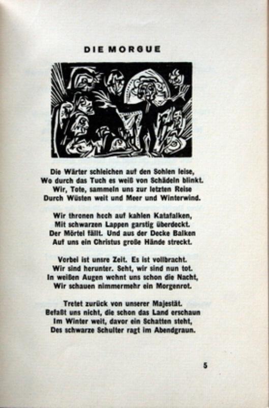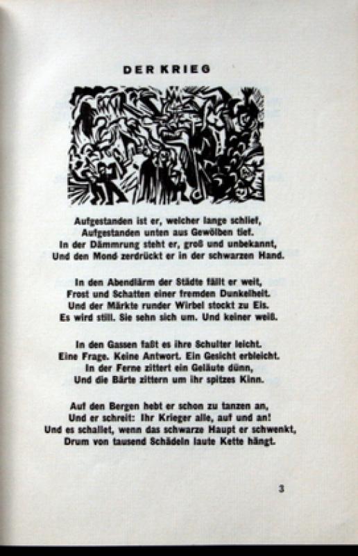"Ein Meilenstein für die Buchkunst: einzig wirklich bedeutendes Dokument des Zusammenwirkens zweier namhafter Vertreter expressionistischer Dichtung und Graphik" (Eyssen). "Some of the most important German expressionist illustrations" (The artist and the book). "Die gesamte Buchausstattung erfolgte nach Angabe des Künstlers, der auch Einband und Vorsatz in Holzschnitt schuf" (Druckvermerk). Unter dem Inhaltsverzeichnis eine bei Dube nicht genannte Holzschnittvignette (Liegender Akt).
