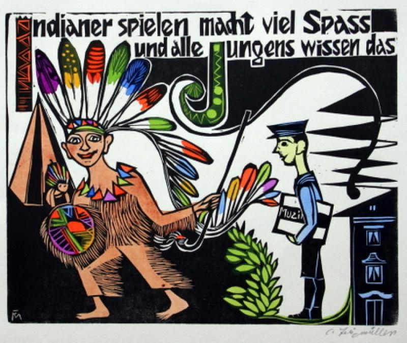 ABC. Ein geschütteltes, geknütteltes Alphabet in Bildern und Versen. Dresden, Selbstverlag, 1925. Zweifarbig gedruckter Holzschnitt-Titel und 15 eigenhändig kolorierte und signierte Holzschnitt-Tafeln von Conrad Felixmüller. 27,5 x 35 cm. Privater Halbpergamentband der Zeit mit vergoldetem Rückentitel, Originalbroschur eingebunden. Söhn 348-363. Pressler 25. Ziersch, Bilderbuch, 182. Rifkind Coll. 617. Jentsch 154. Pommeranz-Liedtke S. 180. - Eines von 100 num. Exemplaren auf Bütten. Druckvermerk und sämtliche Holzschnitte vom Künstler signiert. - 8 Bl. mit kleinem Wasserfleck im oberen w. Rand, Vorsätze erneuert. - Insges. schönes und farbfrisches Exemplar, komplett signiert sehr selten.
