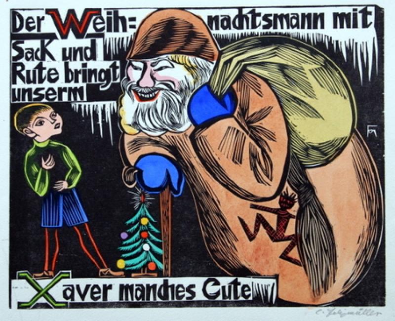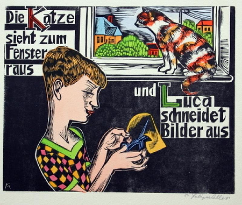 Eines der wenigen Exemplare, die Felixmüller koloriert und auf jedem Blatt signiert hat. Unterhalb der letzten Darstellung mit eigh. Vermerk vom Künstler: "Eigenhändig coloriert - Conrad Felixmüller" (laut Söhn wurden nur etwa 10 Exemplare vom Künstler koloriert). Auf dem Titel- und dem Schlussblatt wird in Holzschnitt erläutert: "Für meine Kinder Luca und Titus und für die Kinder meiner Freunde gezeichnet und in Holz geschnitten ... Unter meiner Aufsicht in der Firma F. Emil Boden Dresden im Dezember 1925 gedruckt." Schön koloriertes ABC-Buch mit Tier-, Zirkus-, Spiel- und Märchenszenen, bei dem Felixmüller ebenso wie die Autorin der Verse das Kunststück vollbringen mussten, immer 2 aufeinanderfolgende Buchstaben des Alphabets in 1 Bild und 1 Zweizeiler zu bringen: "Ein Riese ist der Elefant. Der Fotograf knipst ihn gewandt. - Die Katze sieht zum Fenster raus, und Luca schneidet Bilder aus".