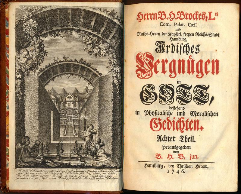 Herrn B. H. Brockes, Lti Com. Palat. Cæs. und Raths-Herrn der Kayserl. freyen Reichs-Stadt Hamburg, Irdisches Vergnügen in Gott, bestehend in Physicalisch- und Moralischen Gedichten. Achter Theil. Hamburg, bey Christian Herold, 1746. 8°. 19 x 12 cm. Gestochenes Frontispitz, Titelblatt Druck in Rot und Schwarz, [4] Blatt, 636 Seiten. Brauner Ganzlederband der Zeit mit goldgeprägtem Rückentitel, goldgeprägtem floralem Buchschmuck, Kanten goldgeprägt schraffiert, Rundum-Goldschnitt.
