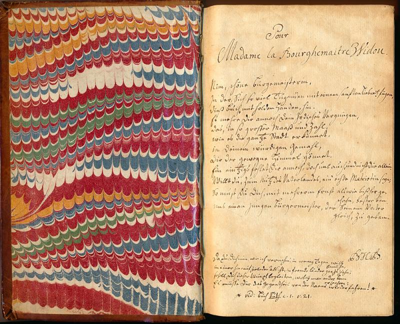 Erste Ausgabe. Wilpert/Gühring 33. VD18 90386345. Dünnhaupt II, 825, 1.VIII. Faber du Faur 1393. Mit gestochenem Frontispiz von Fritzsch nach Peiffer und im italienischem Widmungsgedicht (4 Blatt) an den Kölner Erzbischof und Kurfürsten Clemens August, 2 gestochene Vignetten von Fritzsch: Kopfvignette mit Wappen Clemens August nach Brockes junior und Schlussvignette mit Monogramm Clemens Augusts unter Kurhut. Auf dem Vorsatz mit 20-zeiliger Widmung in Gedichtform von Barthold Heinrich Brockes, monogrammiert 'BHB' an: "Pour Madame la Bourghemaitre Widou [...]. Gemeint ist wohl die Frau des Hamburger Bürgermeisters Conrad Widow (1686-1754), Cornelia, geborene Wiese (1718–1765). Widow bekleidete das Amt 1742 bis 1754. Provenienz: Aus der Sammlung der Galleristen/Antiquarin Ruth Maria Muthmann. Einband minimal berieben, bestoßen. Sehr gutes Exemplar. Widmungsexemplare von Brockes sind extrem selten.