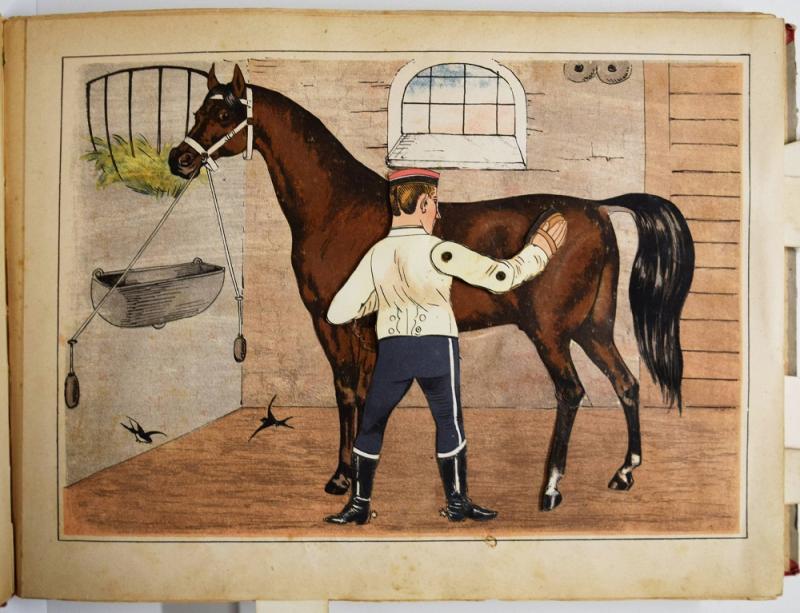 Hobrecker, Braunschweig 5080. Katzenheim 241 f. Krahé 95. LKJ II, 459 f. Ries 713, 73. Seebaß II, 1283. Wegehaupt IV, 2357 (vermutet irrig ein fehlendes Titelblatt). - Erste und einzige Ausgabe; eines der seltensten Spiel-Bilderbücher von L. Meggendorfer. Wie die meisten Spiel-Bilderbücher Meggendorfers ohne ein sep. Titelblatt; die erste Seite mit dem Vorwort. - "Aus dem Soldatenleben zeigt dies Buch Euch allerhand, die Jugend ist ja wohlgeneigt stets dem Soldatenstand" (aus dem Vorwort). Zu sehen sind Rekruten, Husar, Musterung, Turnen, Außer Dienst, In der Schwemme, Bajonettfechten und Regimentsmusik. Meggendorfer verwendet hier nicht nur die von ihm bereits bekannten Ziehmechanismen, sondern dieses Buch verändert sich auch in der Dreidimensionalen. Als konstruktives Gestaltungsmittel benutzt Meggendorfer zur Veränderung der Bilder u. a. eine Tür, die sich in der Szene 'Außer Dienst' öffnet und durch die ein Offizier tritt (der Offizier steckt den Kopf durch den Türschlitz) oder er läßt in der Szene 'In der Schwemme' einen Reiter seinen Arm anheben um sein Pferd zu beruhigen (bei Betätigung des Ziehmechanismus und sein Pferd bewegt gleichzeitig den Schweif). - "Sogar das Militär wird von ihm lächerlich gemacht. In seinem Militärischen Ziehbilderbuch (1890) kontrolliert ein Offizier die Uniformen der angetretenen Soldaten. Als er einen fehlenden Knopf bemerkt, beugt er sich ruckartig vor und deutet mit dem Finger auf diese Stelle. Von einem Gefreiten wird der „Vorfall" gleich in einem Buch notiert" (C. Pohlmann, „Nur für brave Kinder" - Spiel- und Verwandlungsbücher im 19. Jahrhundert). - Deckel leicht fleckig, die Köpfe von 2 Sodaten bei den Tafeln zu "Außer Dienst" und "In der Schwemme" in Farbkopie ersetzt, einige Textblätter mit restaurierten Randeinrissen, das Textblatt "Die Regimentsmusik" mit restauriertem Abriss (kein Textverlust), stellenweise etwas braun- und fingerfleckig, gutes und voll funktionsfähiges Exemplar.