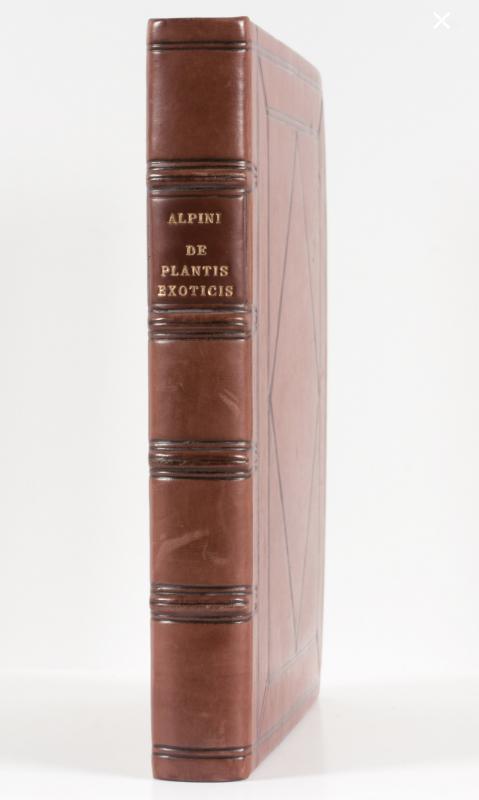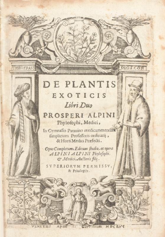 De Plantis Exoticis Libri Duo. Edited by Alpino Alpinus. Venice, J. Guerilium., 1656. Engraved architectural title with portraits of Theophrastus and Dioscorides, [16], 344 pp, 145 etched and engraved botanical plates in text, ornamental initials. Quarto, Full calf binding in the style of the period.