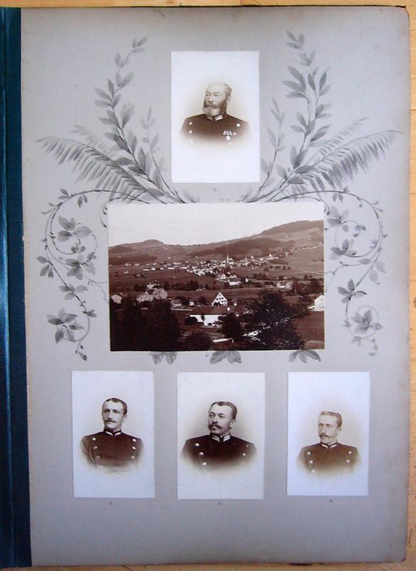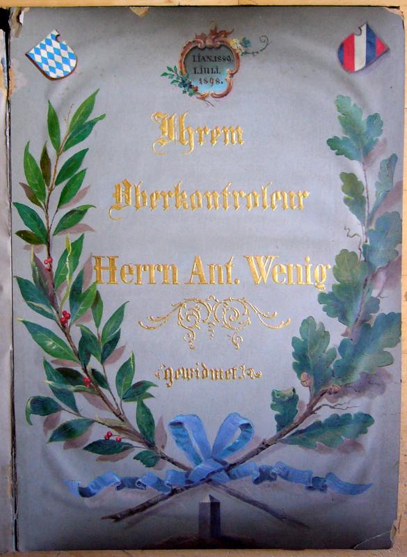 Einzigartiges und prachtvolles Erinnerungsalbum für den Zollbeamten Anton Wenig nach mehr als neun Jahren Tätigkeit als "Oberkontroleur" des Bezirkes Weiler im Allgäu, überreicht zum Abschied von seiner Grenzwachmannschaft und Angehörigen der Grenzoberkontrolle Oberstaufen. Enthalten sind im aufwendig ausgestatteten Album neben dem fein gemalten Titel 32 eingeklebte Original-Photographien auf 6 starken Kartonblättern, teils mit hübscher Verzierung in Tuschpinselzeichnung. Dabei Ansichten der Dienstorte (Lindau, Weiler, Lindenberg, Hausbachwasserfall, Oberstaufen, Scheidegg, Weißachtal, Aach, Oberreute, Wasserfall bei der Eibelesmühle, Balderschwang), zwei von der Mannschaft inszenierte Darstellungen mit "Aufgriff von Schmugglern" an der Grenze zwischen Scheidegg und Weienried, außerdem 18 Porträts von Grenzbeamten des Bezirks. Alles genau aufgeschlüsselt durch Bildlegenden mit Namensnennung in einer handschriftlichen "Erklärung" auf dem hinteren Vorsatz (datiert 11. November 1898). Vor den hinteren Innendeckel montiert das Widmungsschreiben des Oberaufsehers Peter Schuster im Namen seiner Kollegen (datiert Weiler 7. XII. 98) an den jetzt als "Offizial im Zollrechnungscommissariat" in München tätigen Wenig. - Vorsätze brüchig und mit kleineren Randschäden (teils mit Archivpapier verstärkt), die Kartonblätter teils an den Ecken etwas bestoßen, sonst gut erhalten. Der empfindliche Einband an den Kanten zerschlissen, der Rücken defekt, Bindung dadurch gefährdet. - Unikales Dokument für die Geschichte des bayerischen Zolls.