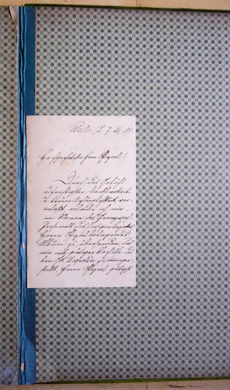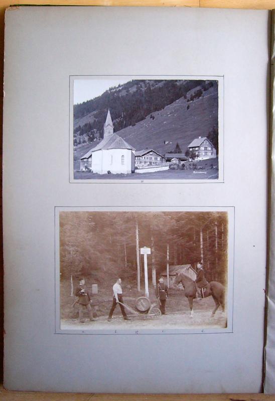 "Erinnerung" (Deckeltitel). "Ihrem Oberkontroleur Herrn Ant. Wenig gewidmet. 1. Jan. 1889, 1. Juli 1898". Weiler, 1898. Fol. (40 x 28,5 cm). Mit aquarelliertem Titel und 32 Original-Photographien. 6 Kartonbl. Original-Samt mit gesticktem Deckeltitel.