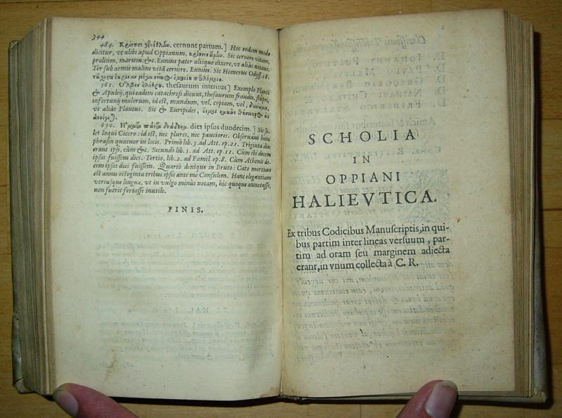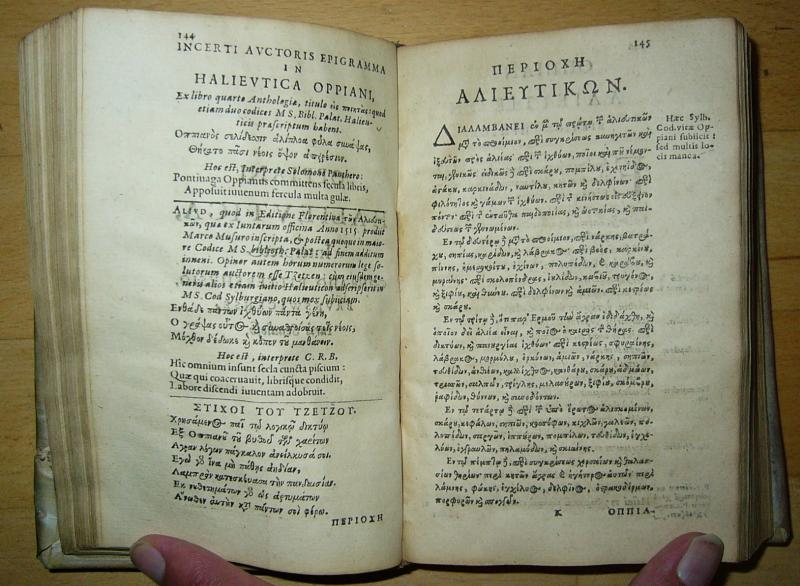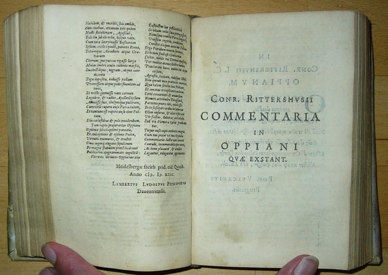 De venatione lib. IIII. De piscatu lib. V. Cum interpretatione latina, commentariis & indice rerum [...] Confectis studio & opera Conradi Rittershusii. Leiden, Raphelengius, 1597. Kl.-8° (16,5 x 11 cm). Mit Druckermarke auf dem Titel. 36 Bl., 376 S., 20 Bl., 344, 164 S., 2 Bl. Pergament der Zeit.