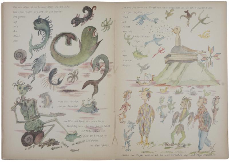 Die Geschichten von Jan und Jon und ihrem Lotsen-Fisch. Leipzig, Ernst Wunderlich, 1948. 4°. 10 nn. Bl., mit zahlreichen farbigen Illustrationen. Illustrierte Originalbroschur mit Deckeltitel, (etwas gebräunt, um unteren Rand wasserfleckig, leicht beschabt).