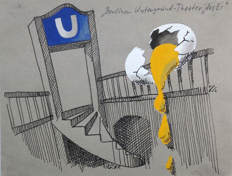 'Berliner Theater - Theater Berlin'. 20 Original-Zeichnungen und Collagen die anlässlich einer Veranstaltung des Bezirksvorstands Berlin des Verbandes Bildender Künstler der DDR am 29. Oktober 1987 im Zentralen Klub 'Die Möwe' auf den Rückseiten der gedruckten Einladungen entstanden sind. Blattgrößen 19,8 x 14,8 bis 19,8 x 29,5 cm, montiert auf schwarze Kartons. In einer neueren schwarzen Box.