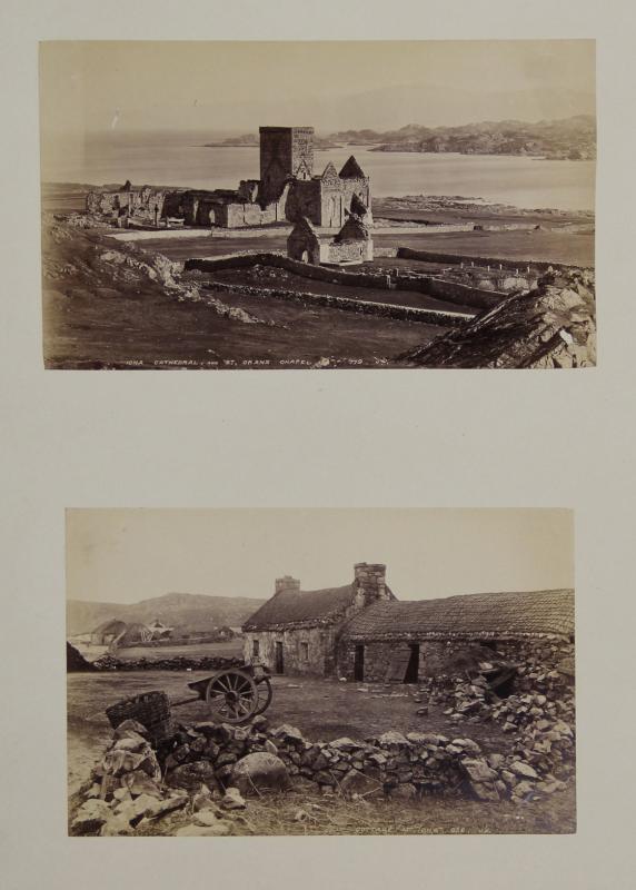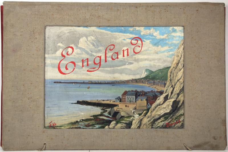 Privat zusammengestellte Mappe mit 79 Original-Fotografien mit Motiven aus England und Schottland. Auf 43 Blatt Karton (31,5 x 41,5 cm) montiert, teils mit einkopiertem Text, meist auf dem Untersatzkarton handschriftlich bezeichnet, teils datiert: 1878. Bildgröße 10 x 6 cm bis 29 x 21 cm. Lose in Leinenflügelmappe der Zeit (42 x 64 cm; etwas angeschmutzt und stockfleckig, Bindebänder defekt) mit großer eingelassener Ansicht von Dover in Original-Temperamalerei, monogrammiert und datiert: (18)86.