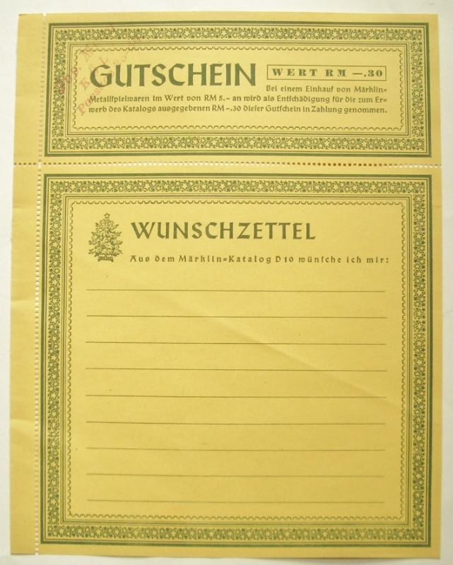 Neben den bekannten Modell-Eisenbahnen wird auch weiteres technisches Spielzeug angeboten: Dampfmaschinen, Schiffe, Kreiselspiele, elektrische Kochherde sowie der Metallbaukasten. - Umschlag mit Eindruck für "Jos. Moog, Köln." - Der "Wunschzettel" liegt lose bei. - Umschlag mit leichten Gebrauchsspuren. 4 Blatt lose. Einige kleinere Einrisse.