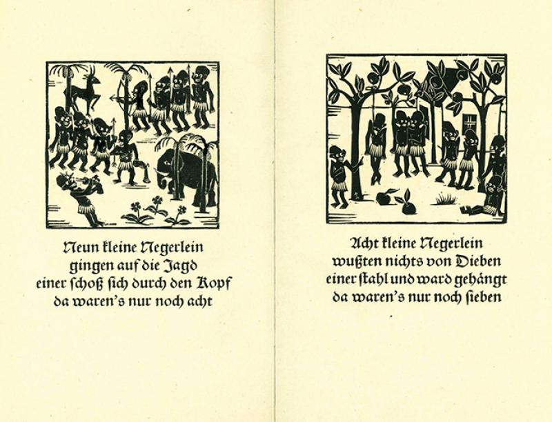 Die zehn kleinen Negerlein. Mit 10 Orig.-Holzschnitten von H(einrich) Hussmann. (Leipzig, Staatl. Akademie für Graph. Kunst u. Buchgewerbe) 1923. 15 x 24 cm. 1 Bl., (14 S.), handgebund. Halbpergamentbd. (Blockbuchbindung) mit Kleister-Überzugspapier u. mit Tusche handgeschr. Rückentitel. Tadelloses Exemplar in (etw. beschädigtem) Schuber. Äußerst selten. Rodenberg 190.