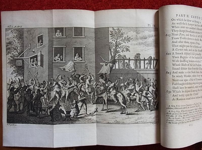 Hudibras, in three parts, written in the time of the wars, corrected and amended with large annotations and preface by Zachary Grey. 2.ed. 2 Bde. London, Hitch, Hawkins, Barthust, Tonson, Worral, Baldwin, Longman, Bathoe, Corbett, Lownds, Kearsly, Becket Nichol and Richardson, 1764. M. gestoch. Frontisp.-Portr. u. 16 (tlw. gefalt.) Orig.-Kupfertafeln nach W.Hogarth, gestoch.v. Mynde. 1 Bl., XXXVI, 424 ( 16 Index) S. u. 1 Bl., 446 (23 Index) S. Ldr.d.Zt. m. 2 farb. RSchildern, reicher RVergold. u. goldgepr. Fileten. (etw. bestoßen, vord. Innenlenk v. Bd. 1 schwach, Loch in ws. Vors.-Bl., Wappenexlibris a. Vors.u. alter Name, wenig gebräunt).