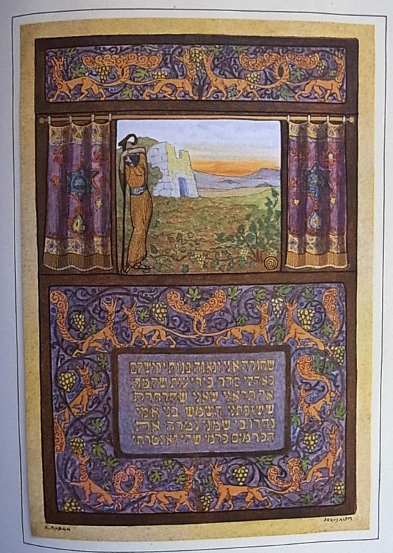 The Song of Song. (Berlin), Hasefer, 1923. 4°. M. 26 mont. Farbtaf. u. Buchschmuck v. Zeew Raban. 32 nn. Bll. OLwd. m. gold. Rücken- u. Vorderdeckeltitel, silbergepr. Vignette u. goldgepr. Bordüre. (Gelenke schwach, etw. gebräunt u. fingerfl.). Eins v. 500 Exempl., hier ohne Nr.
