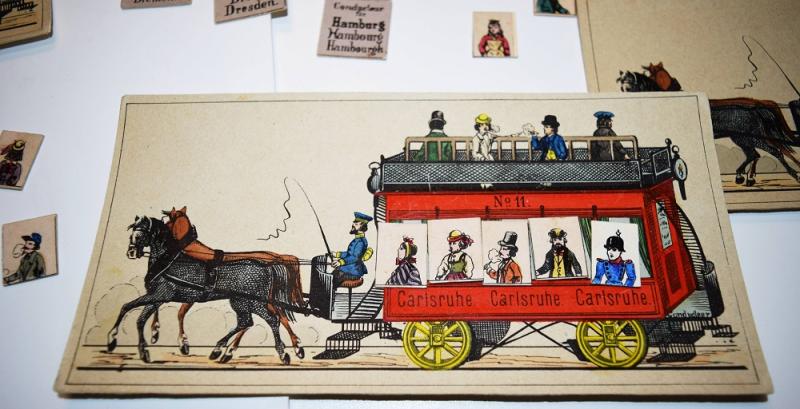 Spiele - Modernes Pferdebahn-Spiel. Moderne Tramway-Game. - Jeu moderne de Tramway. Chemin de fer par chevaux. - Nuovo Giuoco di Terrovia a cavalli. Ohne Ort, Druck und Jahr (Deutschland um 1885). 21 x 22,5 cm. 12 farblithographierte Tafeln auf Karton (11,2 x 21,2 cm.), 60 kleine Bildkärtchen (Passagiere, 2 x 1,5 cm.), 12 "Fahrkarten" mit Aufdrucken verschiedener Städtenamen (die Fahrkarte für "Carlsruhe" mit der Zahl "32", 3 x 3 cm.) und 6 Karten mit den Zahlen 1-6 (6 x 4 cm.). Moderne Pappkassette mit mont. farblithogr. Orig.-Deckelbild.