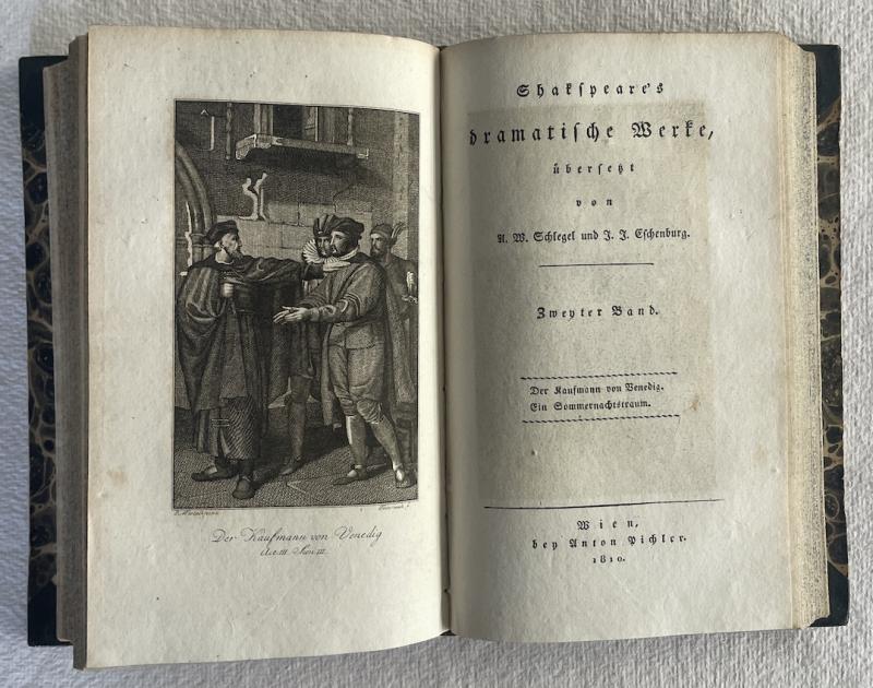 Shakspeare´s (!) dramatische Werke übersetzt von A(ugust) W(ilhelm) Schlegel und J(ohann) J(oachim) Eschenburg. Band 1 bis 18. + Supplemente zu Shakspeare´s (!) dramatischen Werken. Erster und zweiter Band. (mehr nicht erschienen). Mit 20 Frontispize Kupferstichen. Wien, bey Anton Pichler, 1810-1812. 19 x 12 cm. Gebunden in 10 dunkelgrüne Halblederbände der Zeit mit Rückenvergoldung.