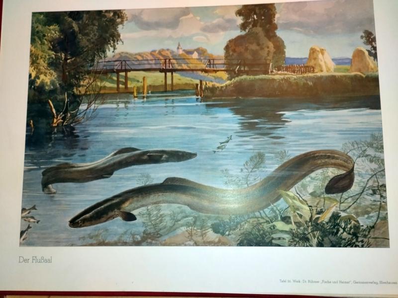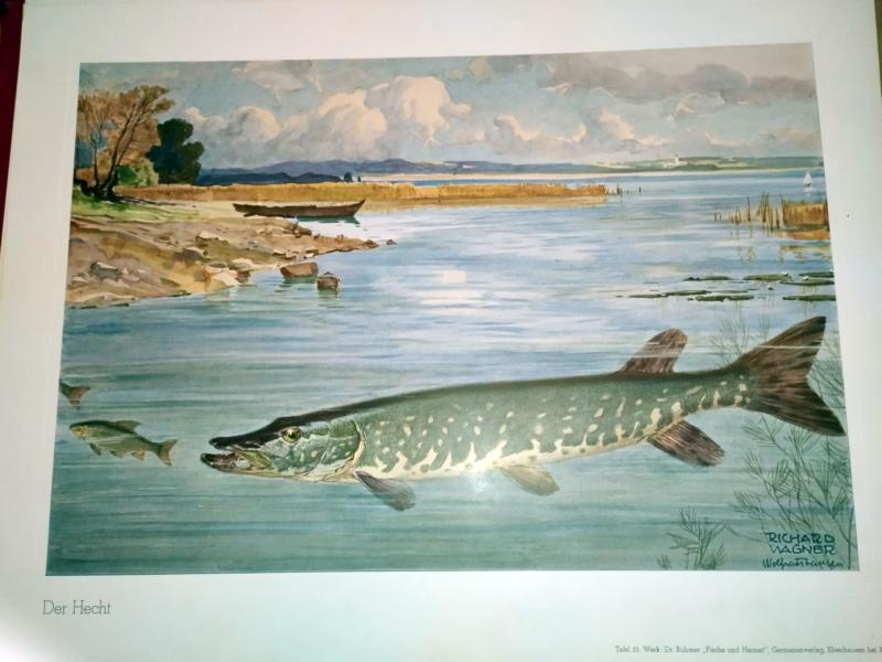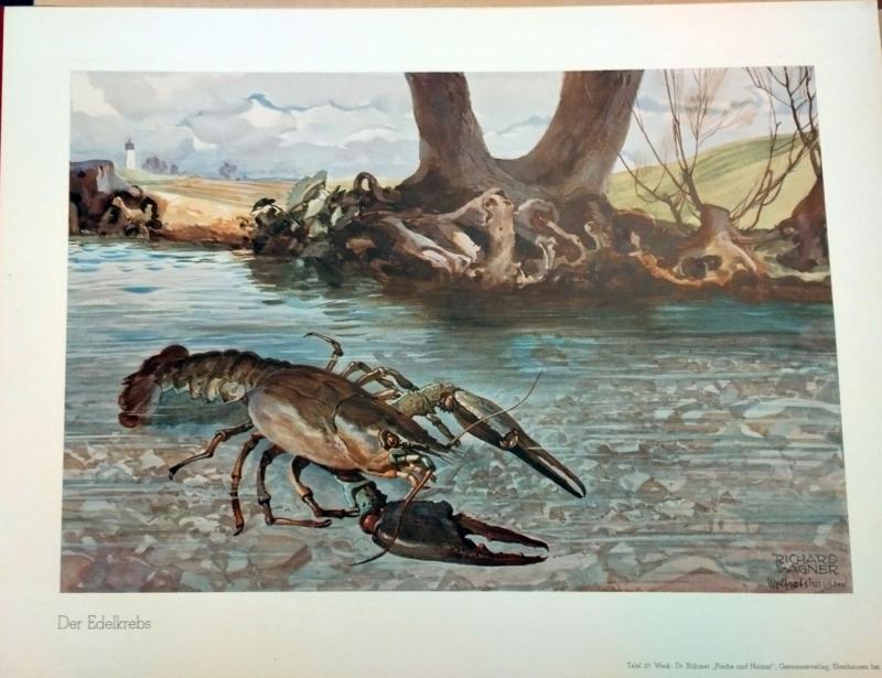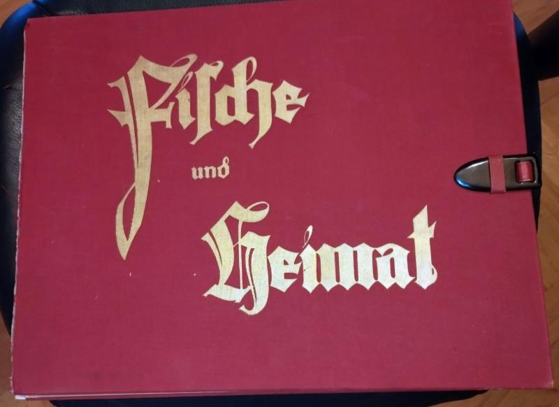 Fische und Heimat. Die Süßwasserfische und ihre Gewässer. Ebenhausen bei München, Germanenverlag, um 1936. Doppelblatt Vorwort u. Tafelverzeichnis mit Erläuterungen und 29 Farbtafeln im Vierfarbenbuchdruck nach Aquarellen von Richard Wagner. Rote OLwd.-Mappe mit goldgepr. DTitel und mit Ldr. befestigter Bakelit-Schließe. 33 x 43 cm