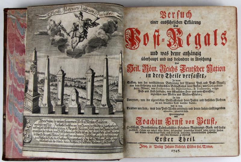 Versuch einer ausführlichen Erklärung des Post-Regals und was deme anhängig überhaupt und ins besondere in Ansehung des Heil. Röm Reichs Teutscher Nation in drey Theile verfasset, in deren Ersten, von der verschiedenen Bedeutung des Wortes Post, und Post-Regal; von dem Ursprung und historischen Beschaffenheit derer Posten; von Cursu publico derer Römer; von Evectionibus seu Diplomatibus, & Tractatoriis, vulgo Post- und Kost-Zedduln; von öffentlichen Heer- und Land-Strassen; ingleichen von Meilen und Meilen-Säulen; In dem Zweyten, von der eigentlichen Beschaffenheit derer Posten und derselben Rechten im heil. Römischen Reich teutscher Nation; Und in dem Dritten von dem, was dem Post-Wesen anhängig und denen dahin einschlagenden Actionibus, gehandelt wird. 3 Teile (alles) in 3 Bänden. Jena, Johann Rudolph Crökers Witwe 1747-1748. Mit gestochenem Frontispiz. 7 Blatt, 560 Seiten, 20; 8 Blatt, 1296 Seiten, 20 Blatt; 16, 938 Seiten, 23 Blatt. 20,5 x 17 cm. Braune Lederbände der Zeit über fünf echten Bünden (beschabt, Wurmspuren, Rücken mit kleinen Fehlstellen) mit roten Rückenschildern, überaus reicher Rückenvergoldung, goldgeprägten gekrönten Wappensupralibros mit dem Monogramm "A.G.V.T.Z.Y." sowie Marmorpapiervorsätzen und rotem Farbschnitt.