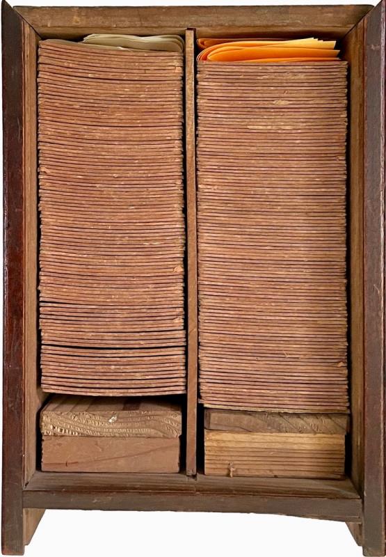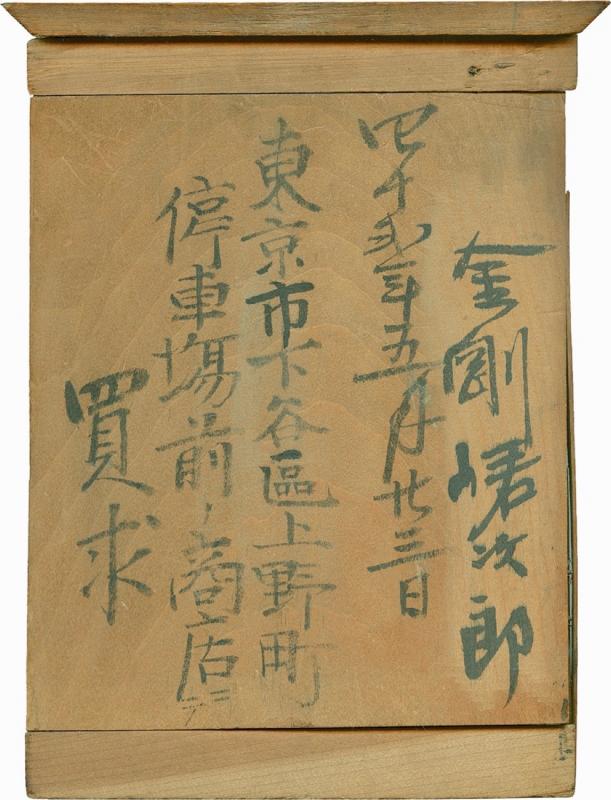 Die Holzschachtel - wohl aus Kirschbaumholz - stammt aus der Zeit um 1909. Das uralte Kartenspiel ist eine Anthologie von japanischen Gedichten aus verschiedenen Jahrhunderten. Es umfasst 200 Blatt, jeweils 100 mit einem Portrait des Dichters / der Dichterin und dem Beginn eines Gedichts und 100 mit dessen Fortsetzung. Möglichst schnell müssen die Mitspieler die Karten einander zuordnen, nachdem die ersten Worte laut vorgetragen wurden. Noch heute ist dieses Spiel in Japan sehr beliebt. Unser Spiel in der Holzschachtel stammt von Sajiro Kongo, Ueno, Shitaya-ku, einem Ort nahe Tokyo. Sajiro Kongo hatte seinen Verkaufsstand vor dem Ueno Bahnhof in Tokyo. Die Spielkarten sind im schablonenkolorierten Holzschnitt und Typendruck hergestellt. Eine Textkarte wurde in alter Zeit ersetzt. Die Karten haben die Maße 71x50 mm und rechteckige Ecken. Die Rückseite ist braun. Der Firmenname befindet sich auf dem Innendeckel der Schachtel. ------The wooden box - probably made of cherry wood - dates from around 1909. This special game is an anthology of Japanese poems from different centuries. It consists of 200 cards, 100 each with a portrait of the poet and the beginning of a poem and 100 with its continuation. The players have to match the cards as quickly as possible after the first words have been recited aloud. The game is still very popular in Japan. Our cards in the wooden box were made by Sajiro Kongo im Ueno, Shitaya-ku, a place near Tokyo. Sajiro Kongo had his sales booth in front of the Ueno Station in Tokyo. The images were printed as stencil-colored woodcuts and the text is type printing. A text card has been replaced in old time. The cards measure 71x50 mm and have rectangular corners. The back is brown. The company name is on the inside cover of the box.