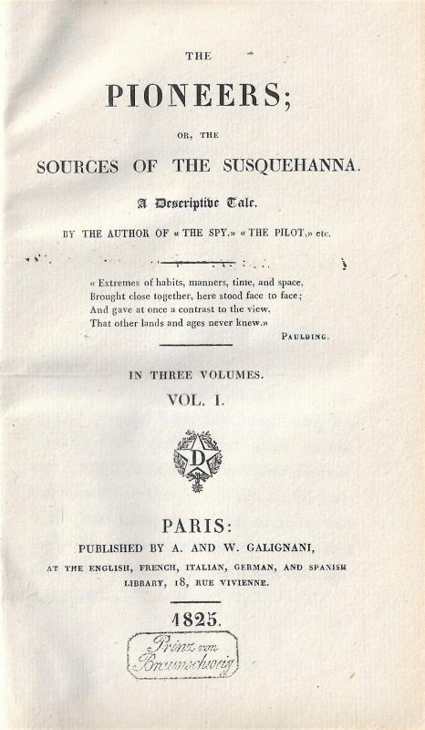 A magnificent Romantic multicoloured inlaid morocco binding for Duke William of Brunswick by the famous court binder Johann Jakob Selenka (1801-1871). He was admitted in 1824 to the Brunswick guild of bookbinders. In 1839 he became court binder of the bibliophile Duke William of Brunswick and Lüneburg (1806-1884) for whom he executed exceptional bindings. He was without doubt one of the most gifted and creative German binders of his period. Characteristic for his brilliantly designed and executed bindings is the use of gilding in different hues: on our item the Gothic corner pieces and the connecting flower roll are impressed with silvery gold, whereas the gilding of the coat of arms and of the spine are tooled with a more reddish gold leaf. Although unsigned (as usual), the binding can be attributed with certainty to Selenka because of the unique style, the used tools (found also on signed books) and the great technical accomplishment. More information (and the description of “The Spy”, the second book published by Cooper) can be found in REH Special List 10 Johann Jakob Selenka / Celebrated Court Binder for Duke William of Brunswick. Early edition and first on the European Continent. It is the first published of the five famous novels, known as the "Leatherstocking Tales" by J. F. Cooper (1789-1851). His Tales were inspired by Sir Walter Scott’s Waverley novels. The Pioneers were first published by Ch. Wiley, New York, in 1823. The protagonist and hero Nathaniel “Natty” Bumppo, also called Leather-Stocking, was a frontiersman, guide, hunter and patriot living in the wilderness. The main theme is the conflict between nature and civilization. Cooper was the first major American novelist, the first American to live from his writing and the first to incorporate African-American and native Indian in his stories. The five Leatherstocking Tales had a worldwide success. – In a striking binding, probably the most spectacular "The Pioneers" has ever been bound in, and with a distinguished provenance. In perfect condition. Ref.: For other Selenka bindings see Martin Breslauer Inc., cat. 108, nos. 43-47, and cat.110, no. 199; M. v. Arnim, OSS-Katalog, Europäische Einbandkunst, p. 187.