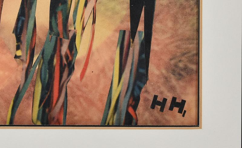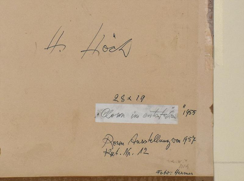 Unikat. Papiercollage auf Karton, hinter Passepartout fixiert. In der Abbildung monogrammiert "H H.", rückseitig von Hannah Höch mit Kugelschreiber beschriftet "Clown im entstehen 1955. Rosen Ausstellung von 1957 Kat. Nr. 12", signiert sowie mit Nachlassstempel von Hannah Höch versehen. Maße Karton: 34,5 x 26,2 cm. Maße Abbildung: 30,0 x 19,5 cm. Provenienz: Privatsammlung. Ausstellungen: 1957 Galerie Gerd Rosen, Berlin und 2008 im Grafikkabinett des Städtischen Museums Gelsenkirchen. Sehr gutes Exemplar. Unique. Paper collage on cardboard, fixed behind a passepartout. Monogrammed "H H." in the illustration, inscribed on the reverse by Hannah Höch with a ballpoint pen "Clown in the 1955. Rose exhibition from 1957 cat. No. 12" signed and with an estate stamp by Hannah Höch. Cardboard dimensions: 34.5 x 26.2 cm. Dimensions illustration: 30.0 x 19.5 cm. Provenance: From the collection of a collector in the Ruhr area. Exhibitions: 1957 roses and 2008 in the graphic cabinet of the Städtisches Museum Gelsenkirchen. Very good copy.
