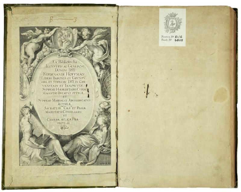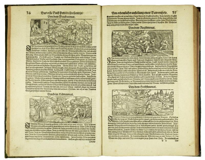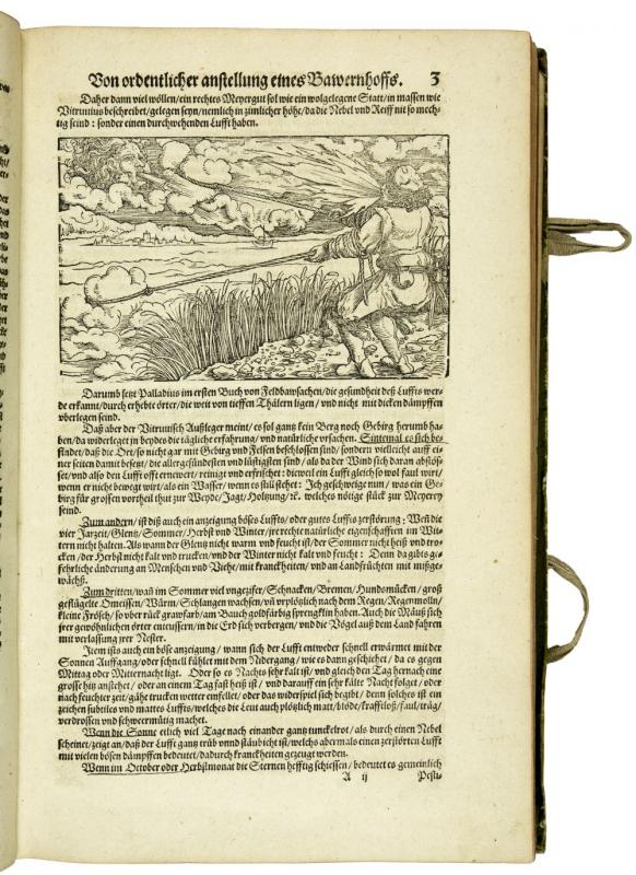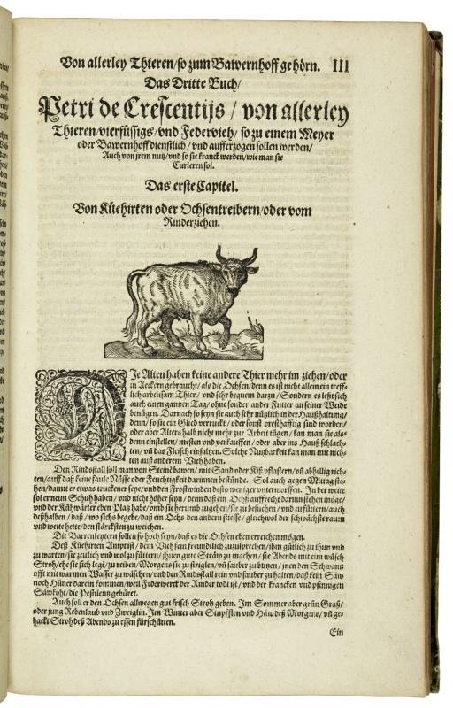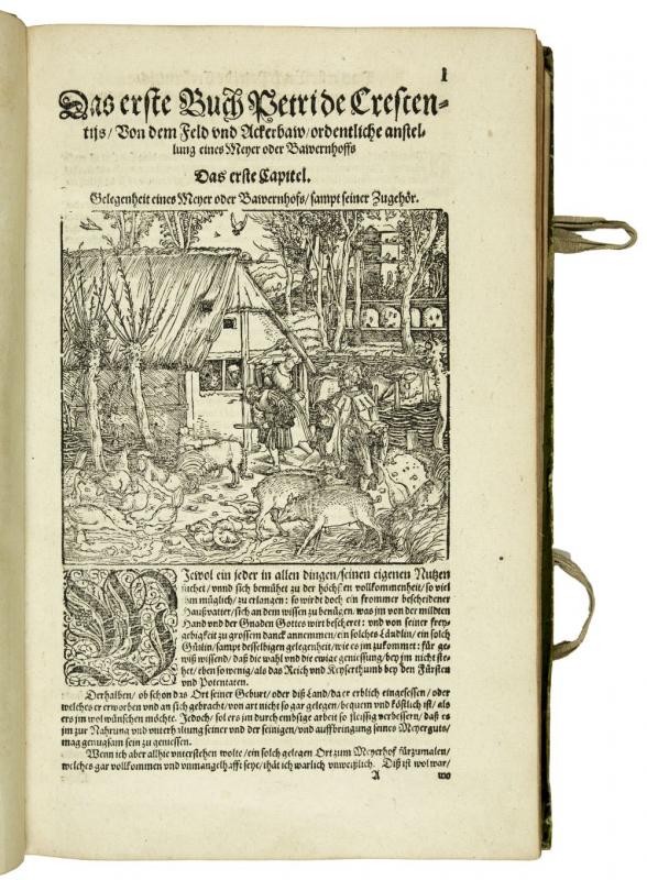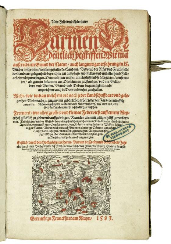 New Feldt und Ackerbaw, darinen deutlich begriffen wie man auss rechtem Grund der Natur auch langwiriger erfahrung in 15 Bücher beschrieben... Franckfurt am Mayn, durch Peter Schmid in verlegung Sigmund Feyrabends, 1583. Folio (333 x 210mm). pp. (12, last leaf blank), 566, (12), title printed in black and red with large woodcut and numerous woodcuts in the text and 1 large folded woodcut of a horse, printer's woodcut device at end. Contemporary green coloured vellum, with large gilt coat of arms on frontcover. An attractively bound and fine copy of the rare first editon of a compilation of Crescentiis' work with that of Estienne & Liebault and Jacques du Fouilloux, a work with splendid woodcuts. "Kompilation aus Crescenzi, den 'Siben Bücher von dem Feldbau' von Estienne und Liébault, Strassburg 1579, sowie dem 'New Jag und Weydwerck Buch' (des J. Du Fouilloux) von 1582" (Nissen). Deals with farming and gardening, animal husbandry, wine growing, fishing, bee-keeping and hunting. The fine woodcuts are by Christoph Maurer and Tobias Stimmer and depict besides botanical subjects, hunting and agricultural scenes. The work is composed as follows: 1. Vom Ackerbaw; 2. Von Mitteln und Arzeneyen; 3. Von allerley Thieren; 4. Von Acker und Fruchtfeldern; 5. Wie man der Weinreben ordentlich warten; 6. Distillierung; 7. Wie man soll sein Garten? zurichten; 8. Von dem Lustgarten; 9. Von Wiesen und Matten; 10. Von den Bienen, oder Immen; 11. Vom Otter und Biberjagt; 12. Vom adelichen Weydwerck; 13. Von Anfang der Jagten, auch vom Jäger; 14. Von der Wölff Eygenschaftt; 15. Vom Brotbacken. Provenance: Oval old library stamp on title, library label of Schloss Pfannberg with crown and shelfnumber on free endpaper, on inside frontcover large engraved bookplate 'Ex Bibliotecha... Ferdinandi Hoffman... Baronis in Grunpuhel...'; on inside backcover engraving with lion and fountain 'Tomaso Baratti e Francesco Damiani a s. Salvador al Pozzo d'Oro in Venetia'. Nissen ZBI, 988a; Lindner page 155.