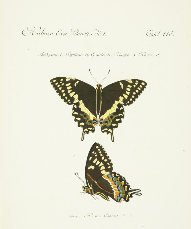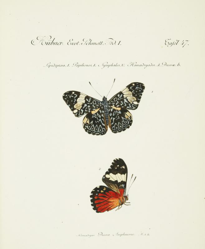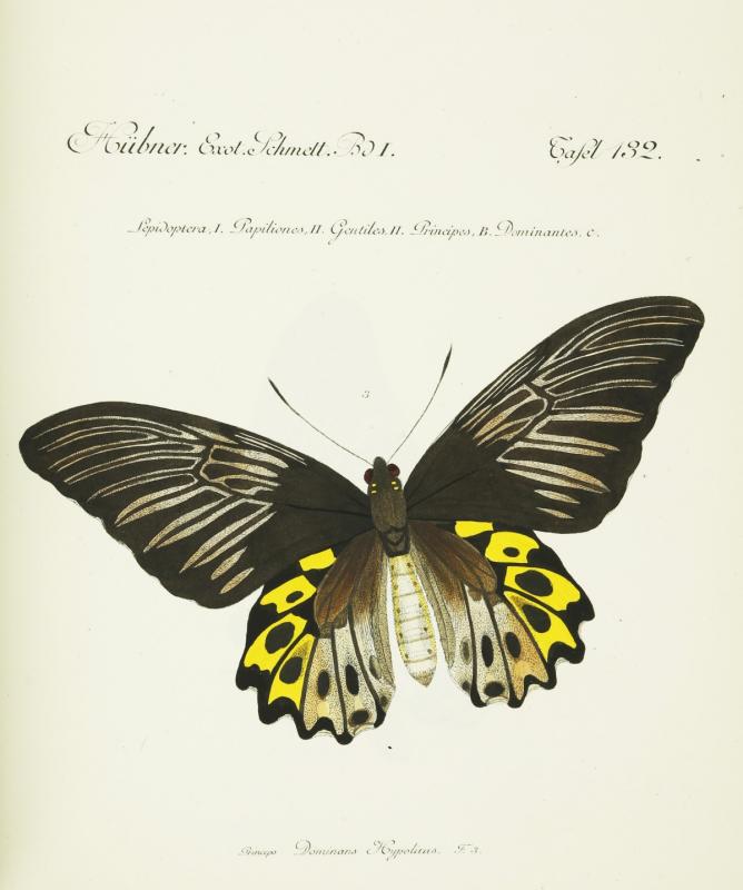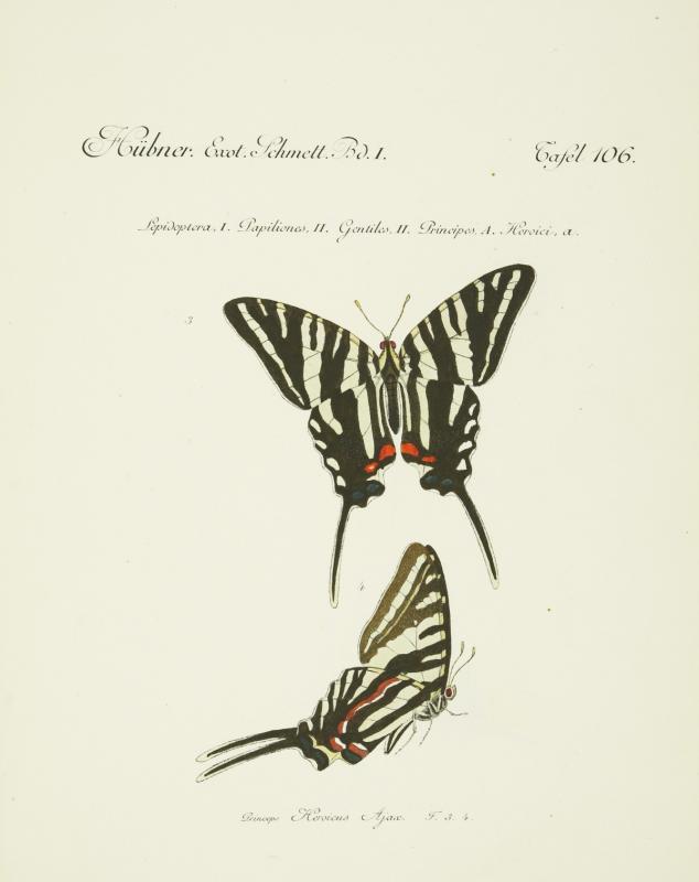 Sammlung exotischer Schmetterlinge (Lepidoptera Exotica). New English fac-simile edition. Edited by P. Wystsman and with additional text by W.F. Kirby. Brussels, V. Verteneuil & L. Desmet, 1894-1897. 3 volumes. Large-4to (282 x 222mm). pp.(10), (8), (10),172, with 491hand-coloured lithographed plates. Contemporary brown half calf, spines with gilt lines and lettering, marbled sides (and:) HUEBNER, J. & GEYER, C. Zuträge zur Sammlung exotischer Schmetterlinge bestehend in Bekundigung einzelner Fliegmuster neuer oder rarer nichteuropäischer Gattungen. New English fascimile edition with 172 coloured plates with Introduction, and Systematic and Alphabetical Indices. Brussels, V. Verteneuil & L. Desmet, 1908-1912. Large-4to (282 x 222mm). pp. (4), 2, 100, (2), with 172 hand-coloured lithographed plates. Contemporary brown half calf, spines with gilt lines and lettering, marbled sides. Rare complete and uniformly bound set, of the English issue, of this beautifully hand-coloured new edition of one of the finest and most important works on exotic butterflies, which was edited in a very limited edition. It comprises Hübner's complete works on exotic butterflies, the 'Sammlung exotischer Schmetterlinge' published from 1806-24 and his 'Zuträge zur Sammlung exotischer Schmetterlinge' published from 1818-37, of which the last part was published by Geyer. Both these two original works are extremely rare and we have not offered copies since many decades. The new edition of these works on exotic butterflies by Wystman and Kirby is superbly produced. The plates are printed on thick, wove paper and exquisitely handcoloured. Also this edition is a great rarity and the number of copies produced minute. Wystman published 3 issues, one with German text, one with English text and one with French text. Probably no more than 50 copies were published. Mr. Kirby says "In writing letter press to Hübner's 'Sammlung exotischer Schmetterlinge', I have paid special attention to the correct identification of the species figured, and in one or two cases I have found it necessary to propose new names. I have not given descriptions, but sufficient synonymy and explanations to bring Hübner's plates into range with later publication" (Entomological Society News 1911). Very little is known about Huebner's life. The rarity of his works is due to the great upheavel caused by the French Revolution and the Napoleonic Wars and the long period of publication. Huebner was a man of modest means, more or less tied to his native town Augsburg. He was a designer in one of the leading cotton factories of the town. His true love and inclination were Lepidoptera. He published a number of beautifully illustrated iconographies on the subject which he published for his own account and he drew and engraved all the illustrations himself. "Nehmen wir als Beispiel die berühmten drei Schmetterlings-Iconographien des Augsburger Insecten-Malers und Muster-Zeichners in einer Kattun-Fabrik J. Hübner (1761-1826), welche als die schönsten Abbildungswerke der Entomologie gelten. Deren 1900 colorierte Tafeln sind als künstlerische Leistungen erst-rangig. (Und in der Reihe solcher Abbildungswerke, die sich die Bibliophilie und die Wissenschaft streitig machen, ist das Hübner'sche Opus eines der wenigen, bei dem der Fall eintritt, dass ihm die Wissenschaft einen höheren Preiss zubilligt, als die Bibliophilie; obzwar sonst infolge der weitaus grösseren Kaufwilligkeit und Kaufkraft, die nach der Kunst hin orientierten Sammlern innewohnt, die Preise solcher auf dem Ueberschneidungs-Gebiet wachsenden Werke eben von der Bibliophilie bestimmt werden)" (Junk. Rara p. 244). Small stamp on half-titles and titles. The work describes among others species from the East Indies, China, India and Australia. A very clean and nice set. See Horn & Schenkling 10905 & 10908 for the original edition and Nissen ZBI, 2040 & 2041 for the original edition as well as the present issue. Also see F. Hemming. 'Hübner. A bibliographic and systematic account of the entomological works of Jacob Hübner...'.