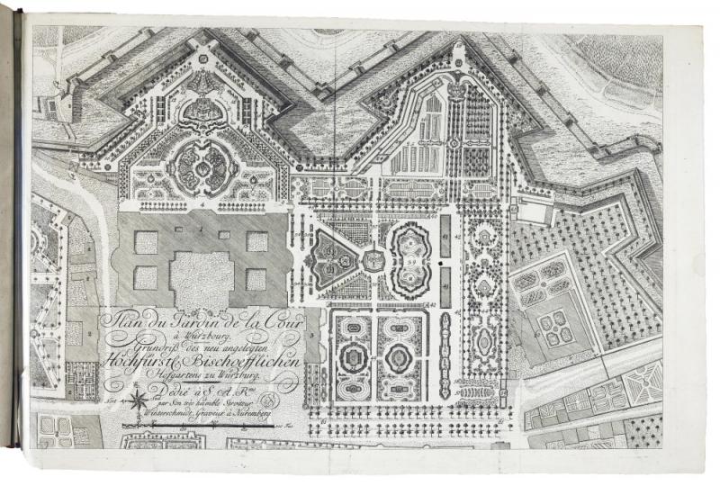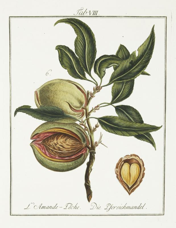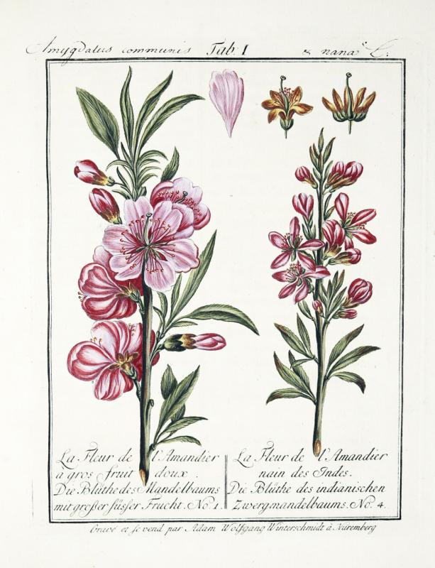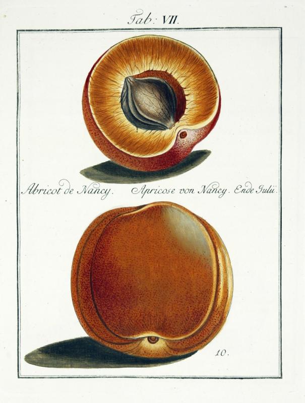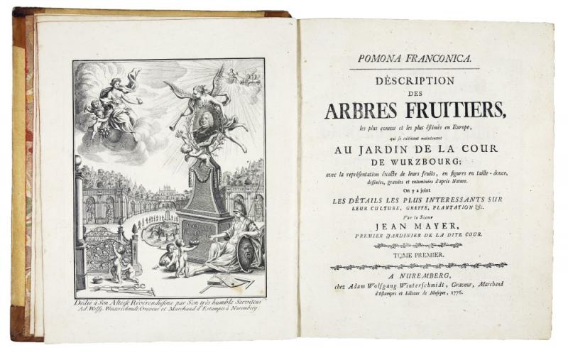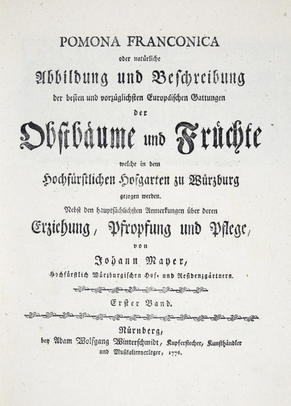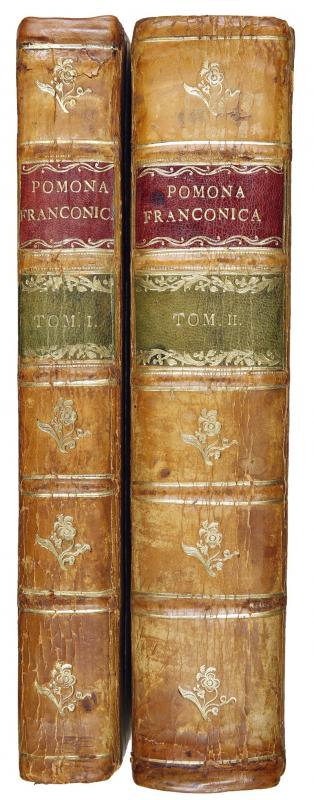 Pomona Franconica oder natürliche Abbildung und Beschreibung der besten und vorzüglichen Europäischen Gattungen der Obstbäume und Früchte welche in dem Hochfürstlichen Hofgarten zu Würzburg gezogen werden. Nebst den haupsächlichsten Anmerkungen über deren Erziehung, Propfung und Pflege... Pomona Franconica. Description des Arbres fruitiers, les plus connus et les plus estimés en Europe... Nürnberg, bey Adam Wolfgang Winterschmidt, 1776-1776. 2 volumes. 4to (245 x 200mm). pp. civ, 152; (4), 364, with engraved frontispiece, 1 folded engraved garden plan, 10 engravings in the text and 110 engraved plates of which 99 spendidly hand-coloured. Contemporary half calf, spines in 6 compartments with gilt ornaments and gilt lettered red and green labels (tiny old repair to top of one volume and foot of the other one). A very fine copy, of the most attractive work on fruit published in Germany. "Der Hochfürstliche Hof- und Residenzgärtner Johann Mayer verfasste das bedeutende Werk 'Pomona Franconica...' Im esten Band sind 12 Aprikosen-, 6 Mandel- und 33 Pflaumensorten enthalten, im zweiten 25 Kirschen- und 32 Pfirsichsorten... " (Martini p.70). "A delightful and charming work" (Dunthorne). "Johann Mayer was born in Prague and learned about gardening in France and England before he settled in Würzburg to look after the garden of the Prince-Bishop, Adam Frédéric, Prince of the Holy Roman Empire, Biship of Bamberg and Würzburg, Duke of Franconia, to whom he dedicated his book, which has a bilingual text... the book was intended to raise the standard of fruit-growing in Germany, and Mayer's training in France helped him to do so" (S. Raphael, An Oak Spring Pomona pp. 135-6). A third volume appeared in 1801, in a very small edition and only a few copies survived. The 3 major botanical collections, de Belder, the Oak Spring library and Plesh collection, do not or did not have a copy of this volume. Adam Wolfgang Winterschmidt (1733-1796), the publisher was also the artist and engraver of the plates. The plates are highly finished, many heightened with gum arabic. The 11 plain engraved plates show pruning and grafting techniques and were never coloured. The text both in German and French. Dunthorne 220; Nissen BBI, 1318; Stafleu & Cowan 5748.
