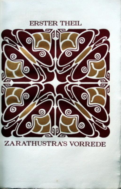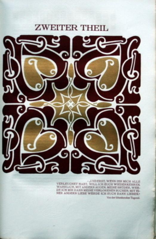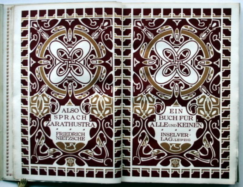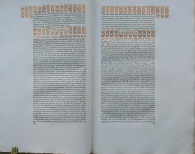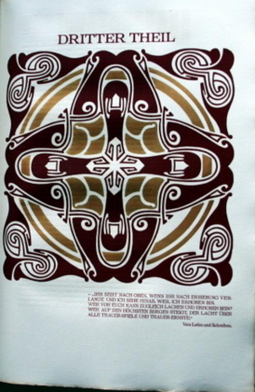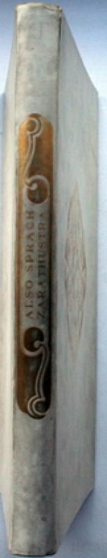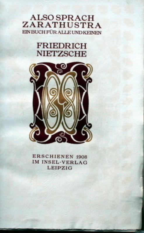 Also sprach Zarathustra. Ein Buch für Alle und Keinen. Leipzig, Insel-Verlag, 1908. 1 w. Bl., 3 Bll., 160 S., 2 Bll. 4° (37 x 24,5 cm), Pergamentband nach Entwurf von van de Velde mit vergold. Rückentitel und großer vergoldeter Deckelvignette, Kopfgoldschnitt. Schauer I, 61 und II, Taf. 16. - Sarkowski 1193. - Eines von 430 Exemplaren im Pergamenteinband (GA 530 Ex.). Eines der Hauptwerke der deutschen Buchkunst. Die Schrift wurde von G. Lemmen gezeichnet und unter Mitwirkung von Harry Graf Kessler geschnitten. Druck bei Drugulin. Henry van de Velde leitete die Drucklegung und entwarf Buchschmuck und -ausstattung: illustrierter Doppeltitel, Titelvignette und 4 Zwischentitel mit großem Ornament in Purpur und Gold, Kopfleisten in Gold, Schlussvignetten in Purpur. - Minimal berieben und Bezug wenig fleckig, Vorsatz mit leichtem Leimschattent, verinzelte schwache Braunflecken inm Schnitt; insgesamt schönes Exemplar. - Auf dem fliegenden Vorsatz Besitzvermerk (A. M. Swinarski, Wroclaw) und Exlibris (Dr. Jürgen Baur, Köln, darn handschriftlich mit Bleistift: E. Prüssen).