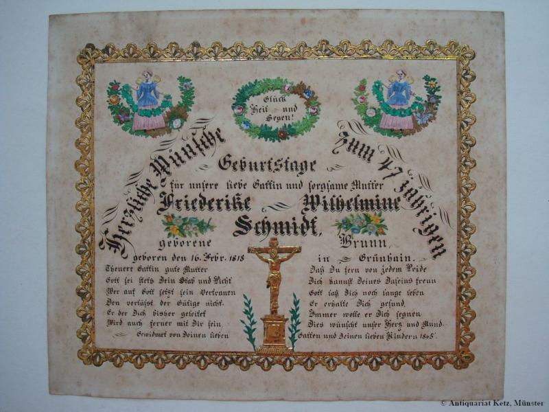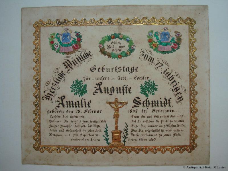 ** Seltenes Ensemble von zwei dekorativen, gleichartig gestalteten Glückwunschbildern – verziert und aufgebaut wie Kunstbilletts. Die Bilder wurden Friederike Wilhelmine Schmidt geb. Brunn zum 47. Geburtstag und Auguste Amalie Schmidt zum 17. Geburtstag gewidmet. In schöner Kalligraphie sind Glückwunschverse aufgeschrieben. Zusätzlich schmücken feine, farbige Papierapplikationen von Figuren, Blumengirlanden, Blüten und – aus geprägtem Goldpapier - ein Kreuz auf Sockel die beiden Blätter. Die beiden persönlichen Spruchbilder entstanden zu den Geburtstagen von Mutter Friederike Wilhelmine Schmidt geb. Brunn, geboren am 16. Februar 1818 in Grünhain, und der Tochter Auguste Amalie Schmidt, geboren am 28. Februar in Grünhain. * Etwas stockfleckig. Sonst sehr gut erhaltene, nahezu einwandfreie Papierantiquitäten.