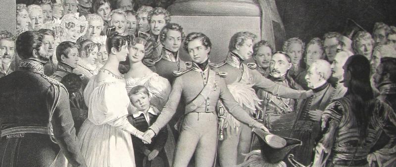 Der junge König von Griechenland inmitten seiner Familie und des Hofstaats beim Abschiednehmen am 6. 12 1832 im Treppenhaus des alten Flügels der Residenz. - Unter dem Titel Widmung von Joseph Löhle an die Mutter von Otto: Königin Therese von Bayern.