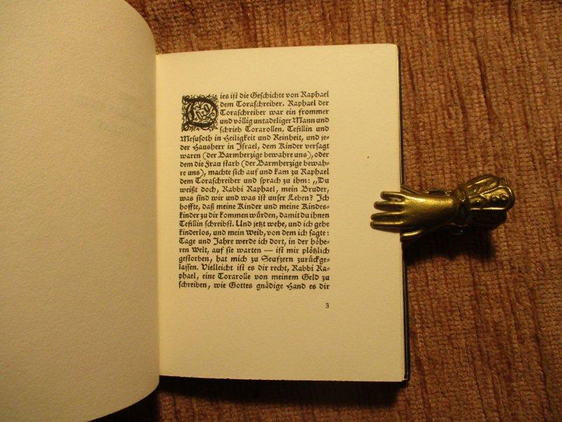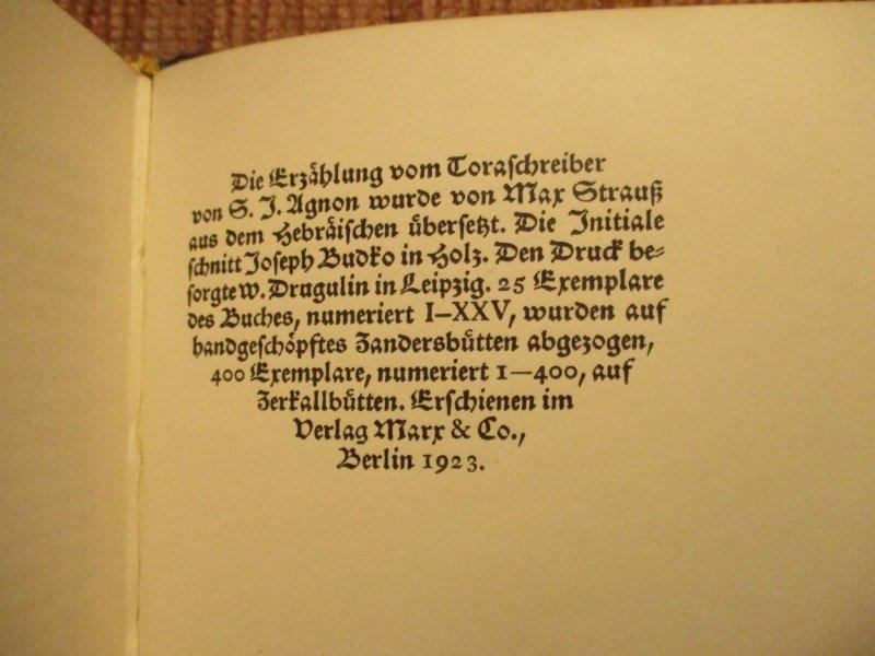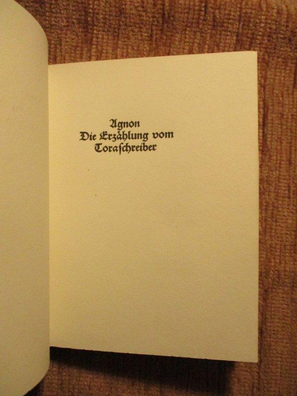Eines von 25 Exemplaren der Vorzugsausgabe auf kräftigem Zanders-Bütten und im Ganzleder-Heinband von H. Sperling, Leipzig. Laut Angaben des Vorbesitzers handelt es sich um das Belegexemplar des Verlegers Abraham Horodisch ohne Nummerierung. Samuel Joseph Agnon (1888-1970), in Galizien geboren, gehört zu den wichtigsten hebräischen Prosaschriftstellern des 20. Jahrhunderts. Seine Werke spiegeln eine tiefe Verwurzelung in den religiösen und geistigen Traditionen der Chassidim und dem Alltag des Ostjudentums. Seine besondere Erzähltechnik und seine eigentümliche Sprache wurden oft mit Thomas Mann und Franz Kafka verglichen. Agnon erhielt 1954 und 1958 den Israel-Preis für Literatur und wurde 1966, zusammen mit Nelly Sachs, mit dem Nobelpreis für Literatur ausgezeichnet „für seine tiefgründige charakteristische Erzählkunst mit Motiven aus dem jüdischen Volk."