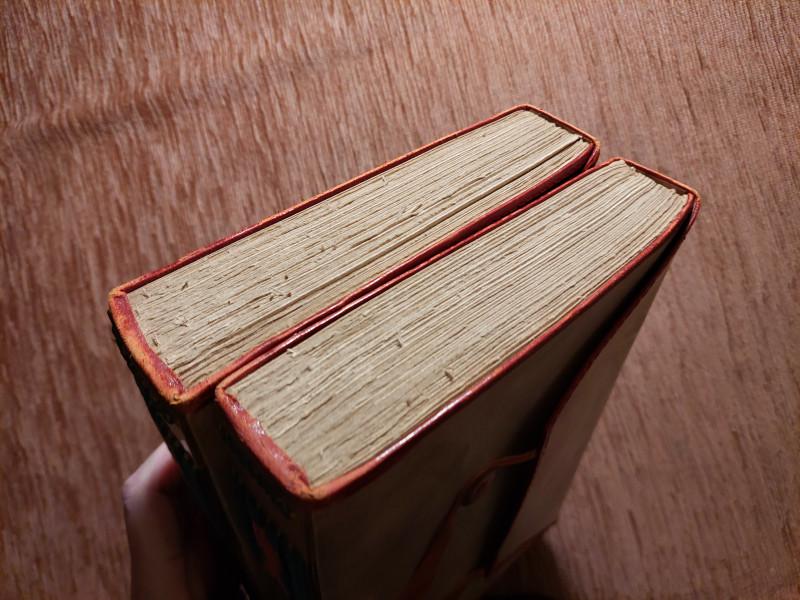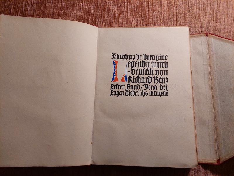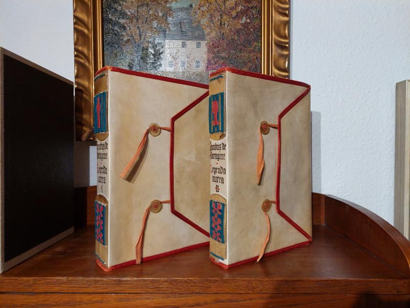 Legenda Aurea. Deutsch von Richard Benz. 2 Bände. Jena, Eugen Diederichs, 1917. 4° (28,5 x 20,5 cm). 3 Blatt, XXVIII Seiten, 2 Blatt, 760 Spalten, 1 Blatt; 4 Blatt, 720 Spalten, 1 Blatt. Wunderbare handsignierte Meistereinbände (Kopert) von Otto Schick/Karlsruhe (MDE) aus dem Jahr 1923. Aufklappbare Pergamentbände mit rot genähten Lederkanten, kalligraphierten Rückentiteln, sichtbarer zweifarbiger Heftung durch Hornplatten und je 2 Verschlussknöpfen aus Horn mit Schlissbändern aus rotem Stoff. Jeder Band mit handschriftlicher Signatur des Buchbinders. In stabilem angepasstem Schuber. Zustand: Sehr gute saubere Exemplare. Lagen Teils noch unaufgeschnitten. Eine Hornplatte mit kleiner Fehlstelle. Lederkanten leicht berieben. Innen tadellos.