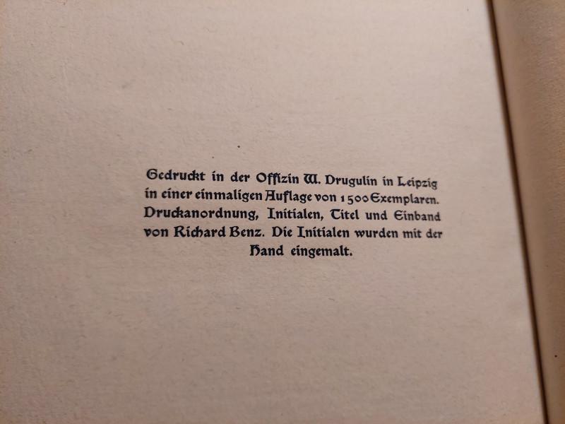 Sehr schön gedruckte, bibliophile Luxusausgabe mit handgemalten Initialen. Druck der Offizin W.Drugulin Leipzig auf büttenähnlichem Papier in einer einmaligen Auflage von 1500 Exemplaren. Ähnliche Kopert-Einbände von Otto Schick sind abgebildet in: Archiv für Buchbinderei Jahrgang 1932, Abb.103. Eine Kopie liegt der Ausgabe bei.