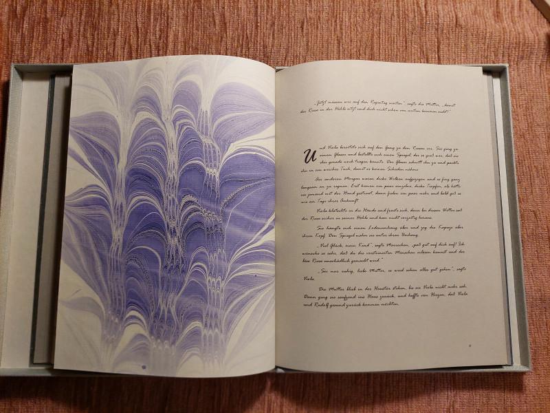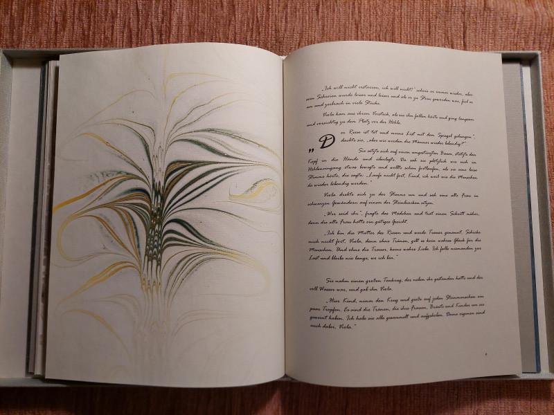 Der Riese, der Verzweiflung hieß.Wunderbares Künstlerbuch der Kunstbuchbinderin und Marmoriererin Annemarie Miessen aus dem Jahr 2002 Privatdruck auf Ingres-Bütten geschmückt mit 12 handmarmorierten Bildern. 4° (26,5 x 21 cm). 26 Seiten. Blockbuchbindung. Handeinband in handmarmorierter grau-silbern schimmernder Seide mit geprägtem Rückentitel und Blattgoldauflage. In angepasster Kassette mit handmarmoriertem Überzugpapier. Von der Künstlerin handschriftlich signiert. Tadellos erhalten