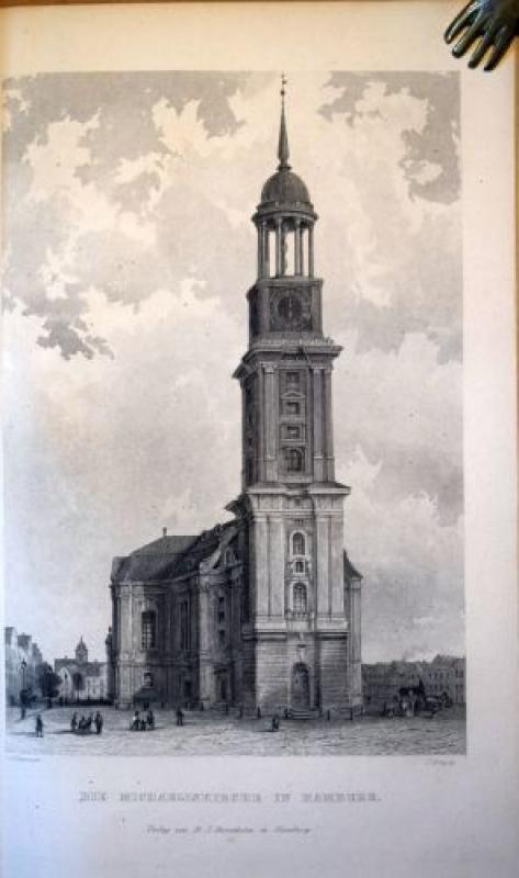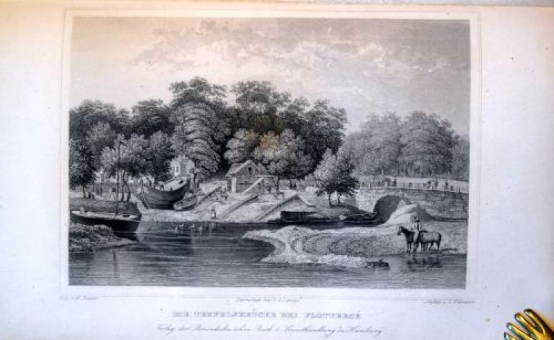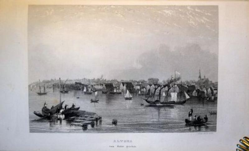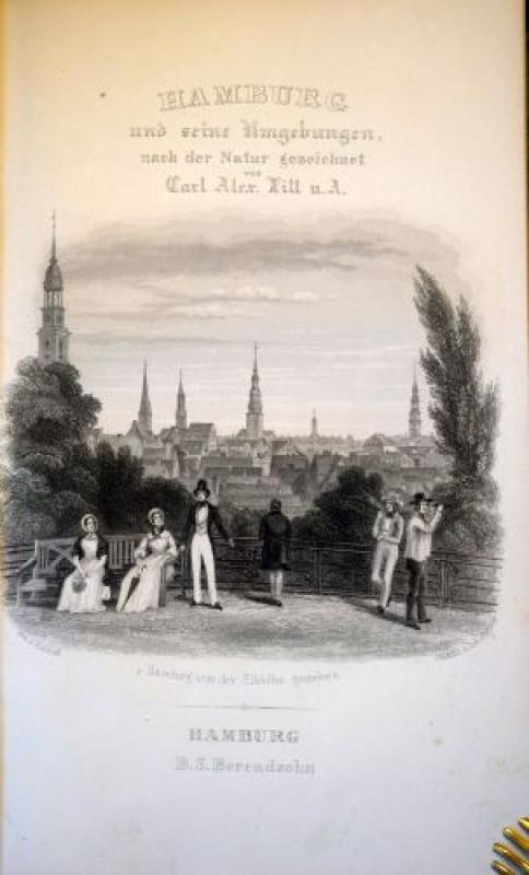 Hamburg und seine Umgebungen im 19. Jahrhundert. Eine Reihenfolge naturgetreuer, in Stahl gestochener Ansichten der Stadt und ihrer Umgegend. (Auf den Stahlstich-Titeln: Hamburg und seine Umgebungen, nach der Natur gezeichnet von Carl Alex. Lill u. A.). 2 Abtheilungen in 2 Bänden. Hamburg, Berendsohn, 1844-48. Mit 2 Stahlstich-Titeln, 1 Frontispiz in Lithographie (Bd 2), zus. 79 Stahlstichen und 1 lithogr., mehrfach gefaltetem Plan (Bd 1). 3 Bll., 181 S., 1 Bl., IV, 40 S. (nicht gezählt die Tafeln). Gr. 8°. OLeinen mit Rückenvergoldung, großen goldgeprägten Deckelvignetten und dreiseitigem Goldschnitt.