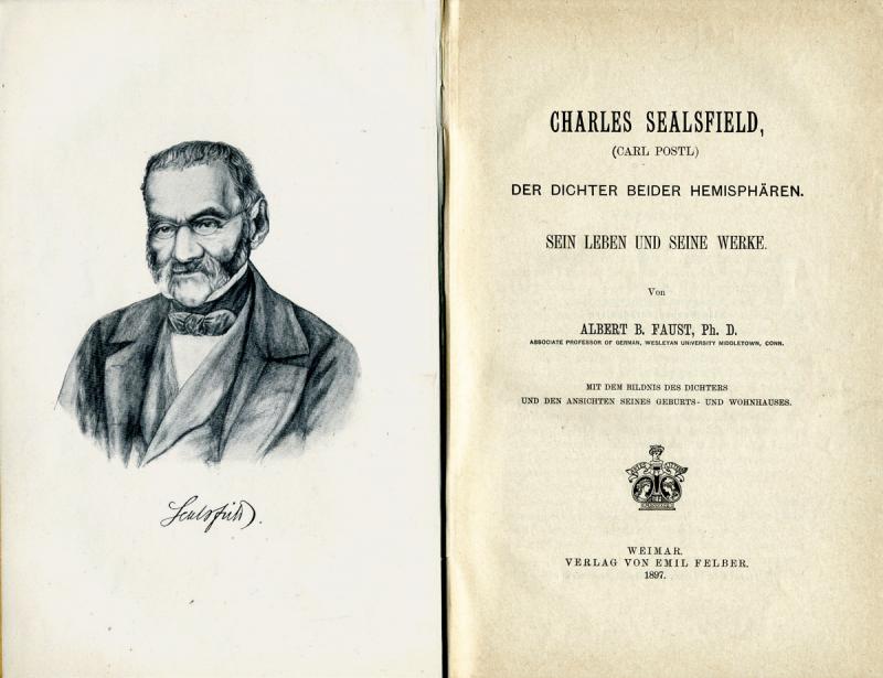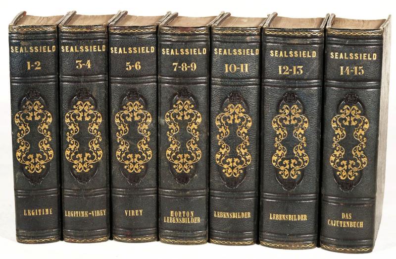 Eine von zwei nebeneinander erschienenen 1. Gesamtausgaben, die andere erschien 1846 in 18 Bänden. Beide Ausgaben enthalten die Romane in der 2. bzw. 3. durchgesehenen Auflage. Der hier als letztes Werk beigefügte und wohl bedeutendste Roman Sealsfields „Das Cajütbuch oder nationale Charakteristiken“ sollte hier erst nicht mit erscheinen. Da er doch dabei ist und „... da als solche [Gesmtausgabe] von vornherein geplant, muß diese Ausgabe tatsächlich als die erste Gesamtausgabe angesehen werden“ (Kresse). Erstmals wir in dieser durchgesehenen Ausgabe Sealsfield auf den Titeln als Verfasser genannt. Die Sammlung enthält: 1. ‚Der Legitime und die Republikaner‘, 2. ‚Der Virey und die Aristokraten‘, 3. ‚Morton oder die große Tour‘, 4. ‚Lebensbilder aus der westlichen Hemisphäre‘ und 5. ‚Das Cajütenbuch oder nationale Charakteristiken‘. Sealsfield, eigentl. Carl Anton Postl (1793-1864) aus Poppitz bei Znaim, gilt als Begründer des exotisch realistischen Romans. Nach streng überwachter Jugend und nach dem Besuch des Jesuitengymnasiums in Znaim tritt er in den Kreuzherrenorden ein, wo er bis zum Sekretariatsadjunkt aufstieg, studierte in Prag Theologie u. a. bei Bernard Bolzano, und empfing 1814 die Priesterweihe. Jeder Wunsch an die Eltern, ihm ein freieres Leben zu gestatten, wurde brüsk abgelehnt. Schließlich flüchtete Postl 1823 über Wien und Stuttgart in die USA, wo er sich eine neue Identität aufbaute, zuerst als Charles Sidons, dann als Charles Sealsfield. Er lebte zunächst als protestantischer Geistlicher in Kittanning im US-Bundesstaat Pennsylvania und danach in New Orleans. 1826/27 war er wieder in Europa, u. a. in London, und ließ seine ersten Veröffentlichungen erscheinen. Wieder in den USA erforschte er den Kontinent von Mexiko bis in die Neu-England-Staaten und entwickelte sich zum entschiedenen Gegner des puritanisch-calvinistischen Kapitalismus der Nordstaaten. In seinen Romanen zeigt er eine bemerkenswerte Vertrautheit mit den politischen, ökonomischen und sozialen Zuständen der Union. Unglaublich ist seine umfassende, in nur 8 Jahren erworbene Kenntnis von Landschaften, Zuständen und Menschen ungeheurer Gebiete. In seinen Schriften „erarbeitete Sealsfield ein politisch-soziologisches Romanwerk, das von barocken Grundlagen unmittelbar zum amerikanischen Roman der Gegenwart – Hemingway, Steinbeck, Faulkner – reicht. Als höchste dichterische Leistung stellt sich die prosaepische, im deutschen Schrifttum einmalige Bewältigung des neuen amerikanischen Lebensgefühls dar“ (E. Alker). In seiner Romantechnik verwendet er das Nebeneinander der Romane Gutzkows lange vor diesem. Besonderer Wert wurde vom Verleger auf ein schönes Druckbild gelegt. „Diese Metzler’schen [Drucke] waren seinerzeit mit die ersten Verlagserzeugnisse, die einen in jeder Hinsicht schönen Druck aufweisen, der noch jetzt als mustergültig angesehen wird“ (A. Kresse). Während eines weiteren USA-Aufenthalts war er u. a. in New York als Mitarbeiter bei der Zeitung Courrier des Etats-Unis tätig und hatte Kontakt mit Joseph Bonaparte. Später wandte sich Sealsfield mit seinem in der Folge berühmtesten Werk, Das Cajütenbuch oder Nationale Charakteristiken, wieder dem amerikanischen Westen zu. Im Zentrum des komplexen Textes – einer zuhörenden Gruppe von reichen Plantagenbesitzern aus Natchez, Mississippi werden mehrere Geschichten erzählt – stehen die texanische Revolution und der südamerikanische Freiheitskrieg. Besonders die erste der Binnenerzählungen, Die Prärie am Jacinto, festigte Sealsfields Ruhm und wurde wiederholt als Einzeltext ediert – zumeist um die auch hier anzutreffende politisch-didaktische Komponente verkürzt. Ende 1830 kehrte er nach Europa zurück, ließ sich in der Schweiz nieder und erlangte mit mehreren zunächst anonym veröffentlichten Romanen auch internationale Erfolge. Bis zu seinem Tod konnte Sealsfield seine wahre Identität verbergen. – Papier unterschiedlich, teils auch stärker braun- u. stockfleckig. – Goed. XV 631, 338; Rabenlechner I, 84; Kresse S. 14; Brieger 2232; Eymer 270.