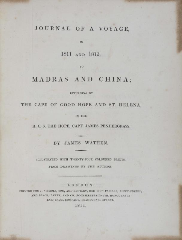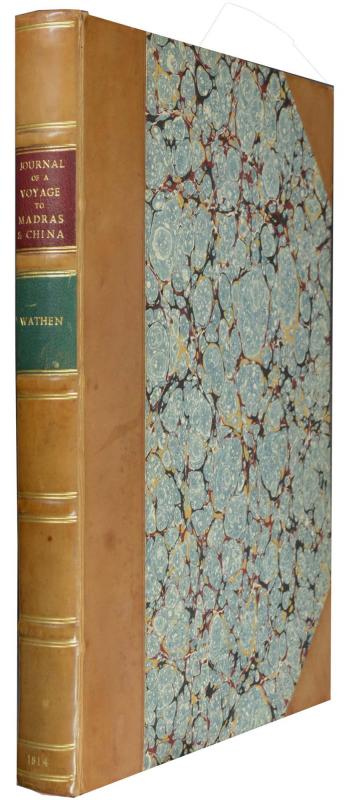 Erste und einzige Ausgabe. - Abbey, Travel 517; Cordier BS 2107; Mendelssohn II, 591. - Beschreibung einer Reise, an der der englische Geschäftsmann James Wathen (1751-1828) an Bord eines Schiffes der East India Company teilnahm. Über Madeira und dem Kap der Guten Hoffnung reiste man nach Madras, Penang, Malacca, Singapore, Macao und China und zurück über St. Helena. - Die hübschen Tafeln nach Vorlagen des Autors zeigen Landschaften, Tempel und Ortschaften Indiens, Malaysias, Chinas, sowie St. Helenas. - Etwas stockfleckig, Namensschild auf Innendeckel.