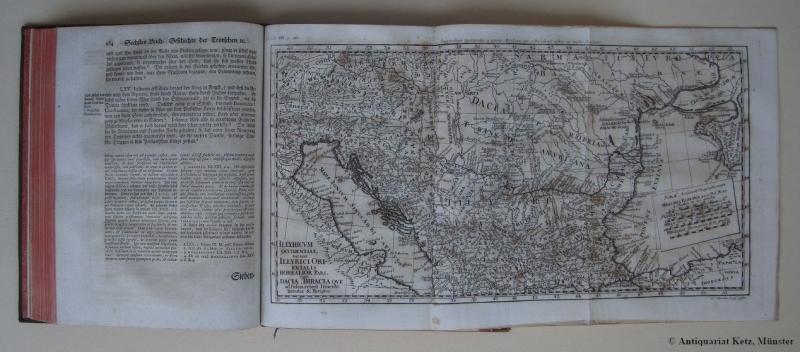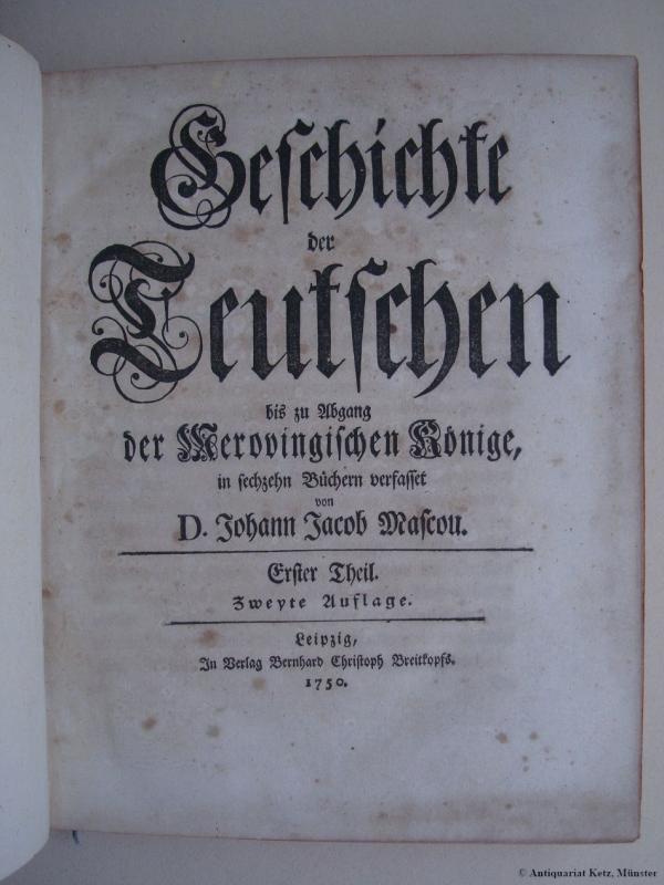 Geschichte der Teutschen bis zu Abgang der Merovingischen Könige, in sechzehn Büchern verfasset. Zweyte Auflage. 2 Bände. Leipzig, Bernhard Christoph Breitkopf, 1750. Mit 2 gefalt. Kupferstichkarten und 1 gefalt. Stammtafel. 14 Bl., 508 S., 8 Bl./ 10 Bl., 342 S., 1 Bl., 246 S., 10 Bl. Quart (26x20 cm). Ganzlederbände der Zeit, Rückenschildchen, Rückenvergoldung, Deckel mit zarter Vergoldung, Rotschnitt, Buntpapiervorsätze, Lesebändchen.